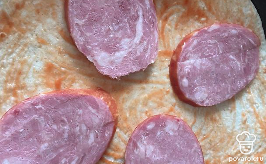 Смажьте основу кетчупом. Нарежьте тонкими ломтиками колбасу и выложите сверху.