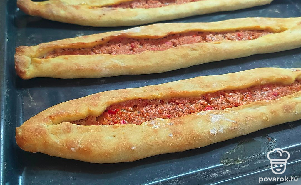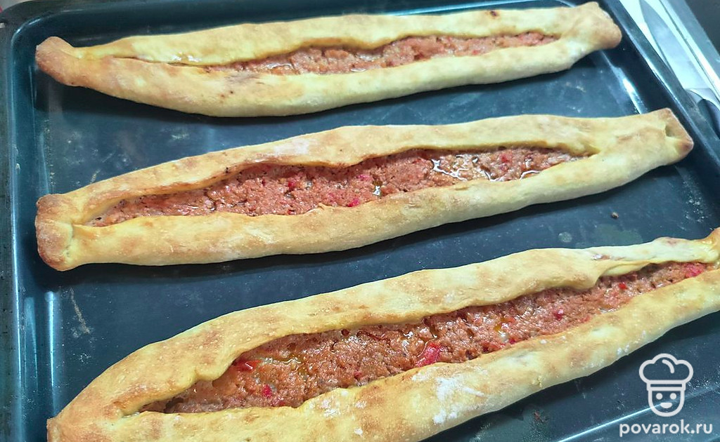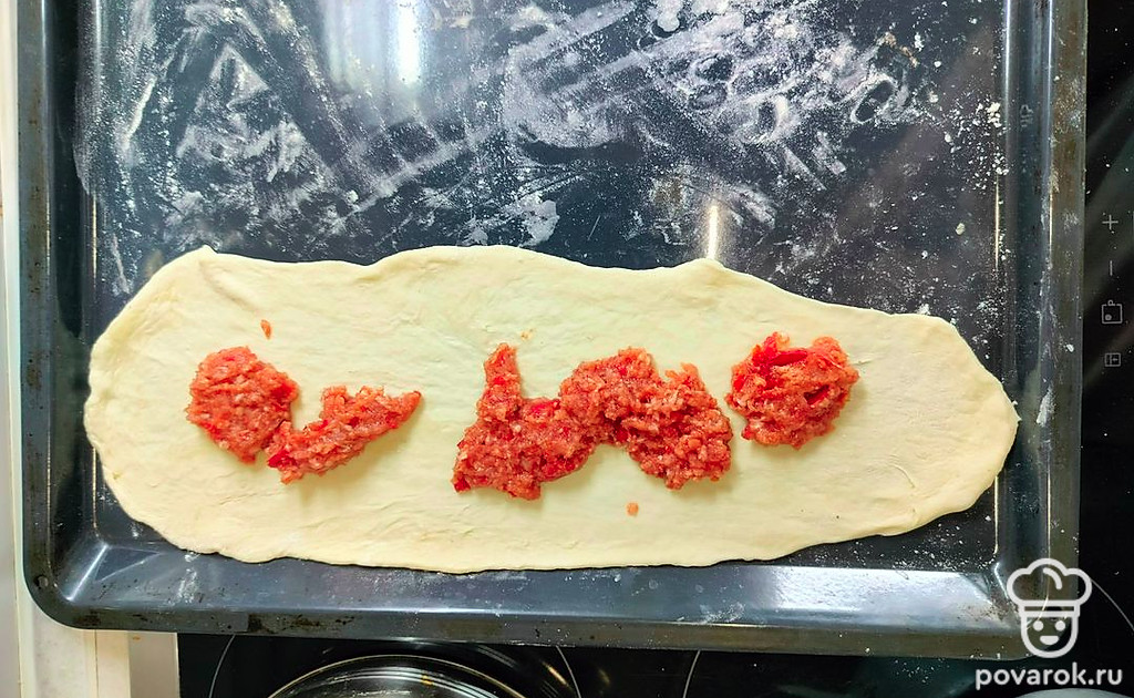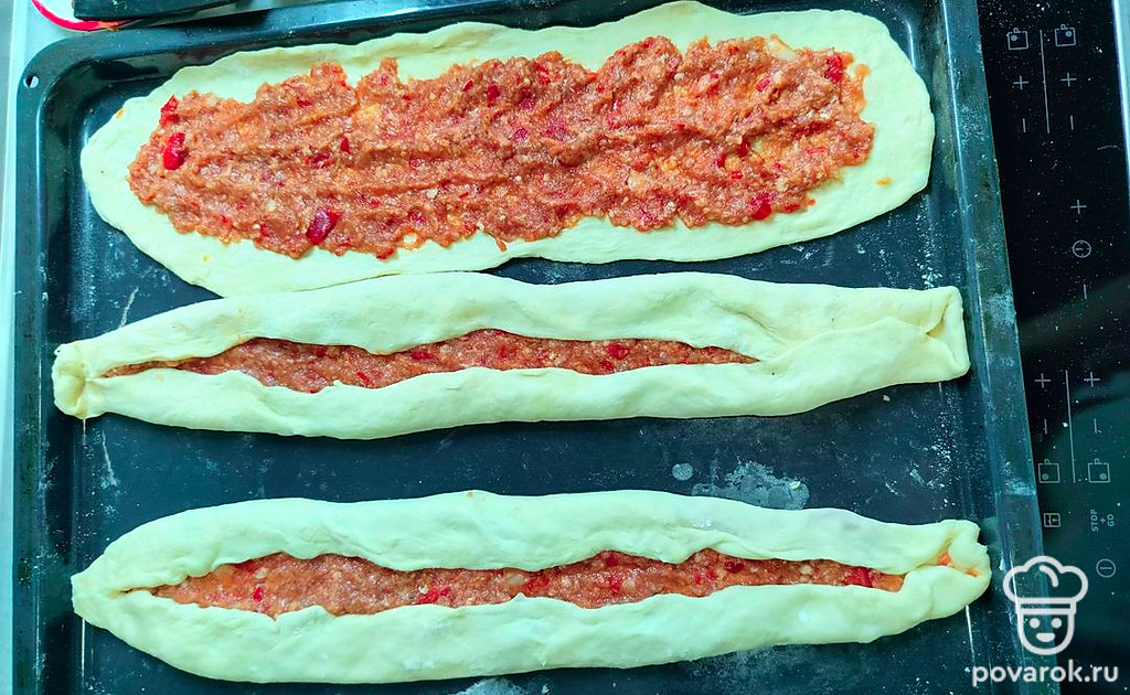 Тесто разделите на три колобка. Раскатайте каждый в длинный овал по длине противня. Переложите тесто на присыпанный мукой противень.