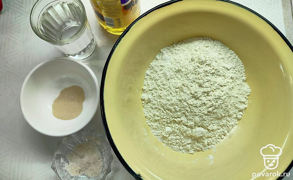 В муку добавьте сухие дрожжи и соль. Влейте воду и перемешайте. В конце добавьте растительное масло.