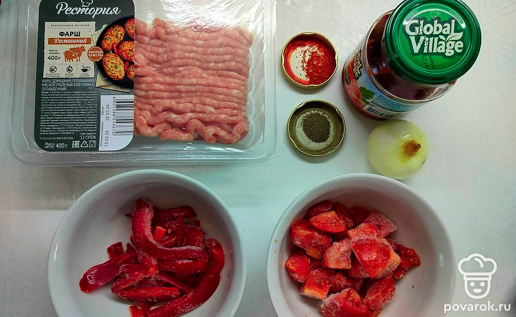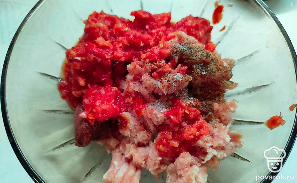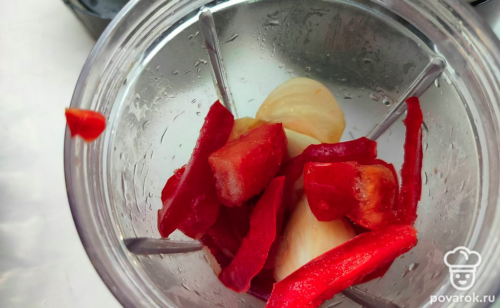 В чашу блендера выложите перец, помидор, лук. Пробейте до однородности.
