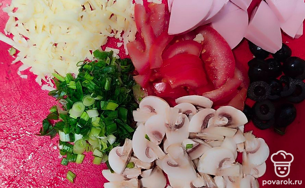 Грибы, помидоры и лук помойте. Нарежьте грибы, помидоры и колбасу четвертинками колец. Маслины нарежьте тонкими колечками, а зеленый лук мелко нашинкуйте. Сыр натрите на крупной терке.