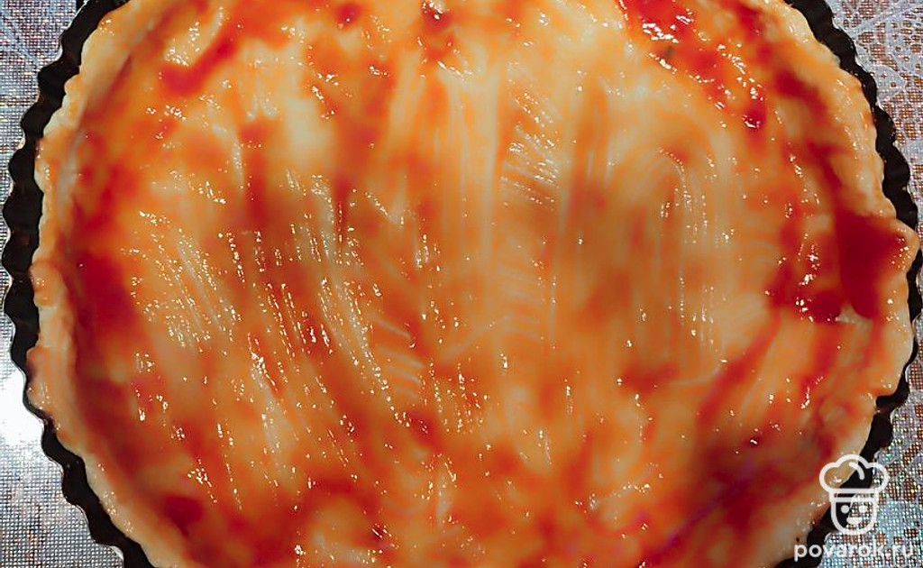 Смажьте готовое тесто кетчупом (соусом или томатной пастой).
