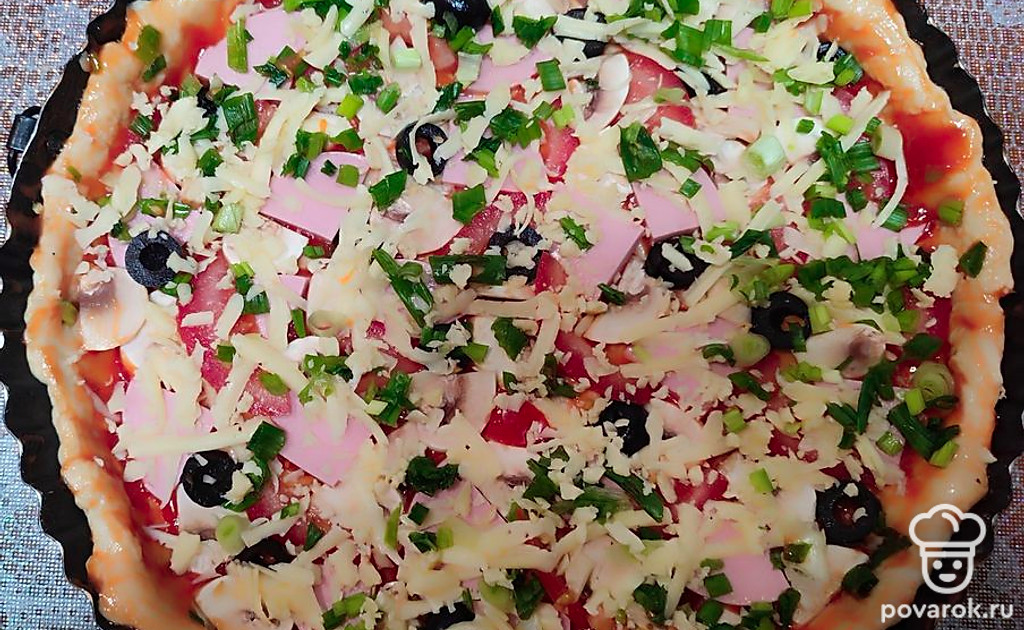 На подготовленное тесто выложите нарезанные ингредиенты (грибы, помидоры, колбасу, маслины), сверху посолите по вкусу. Затем посыпьте тертым сыром и зеленым луком. Поставьте в духовку на 15-20 минут при 170 градусах.