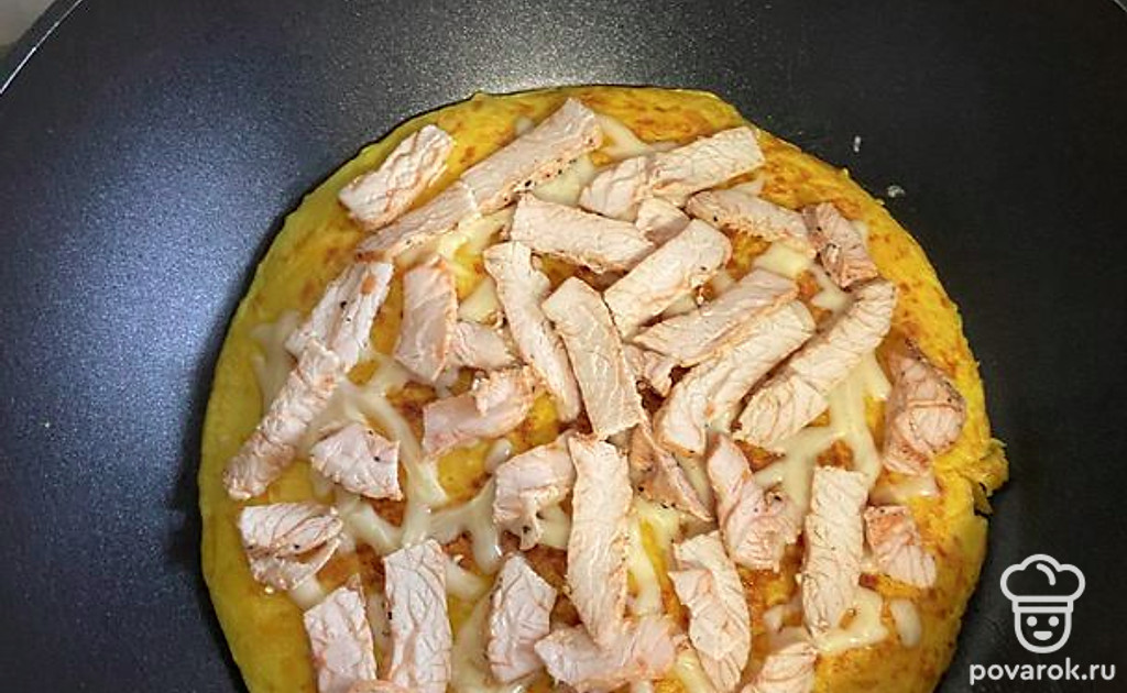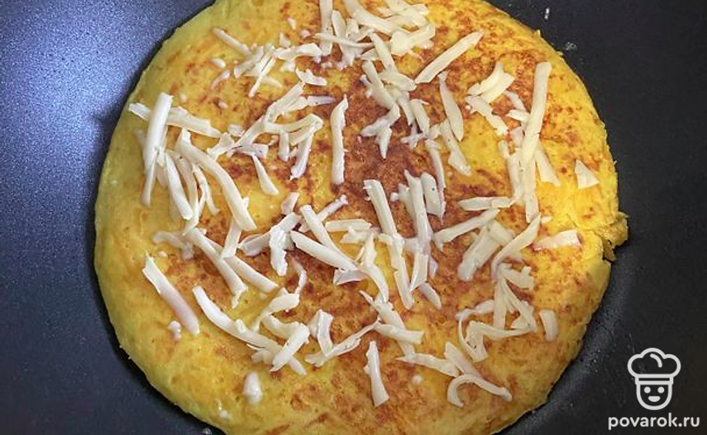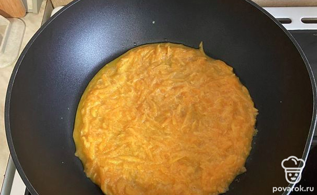 Распределяем равномерно по сковороде, обжариваем с одной стороны 5 минут, переворачиваем.