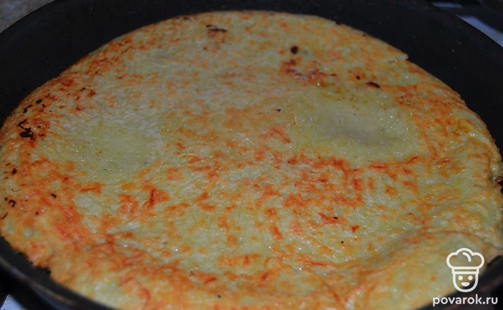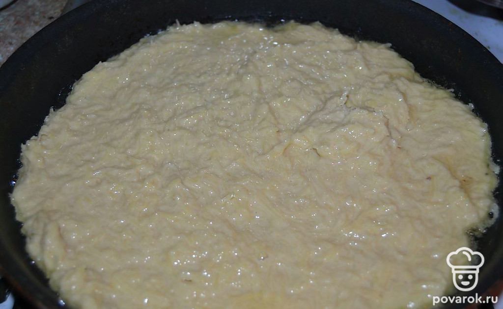 Выкладываем полученное тесто на разогретую сковороду, смазанную растительным маслом. Распределяем ровным слоем, накрываем крышкой и жарим 5 минут на среднем огне.