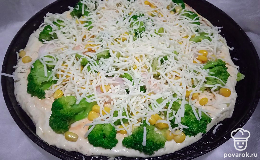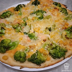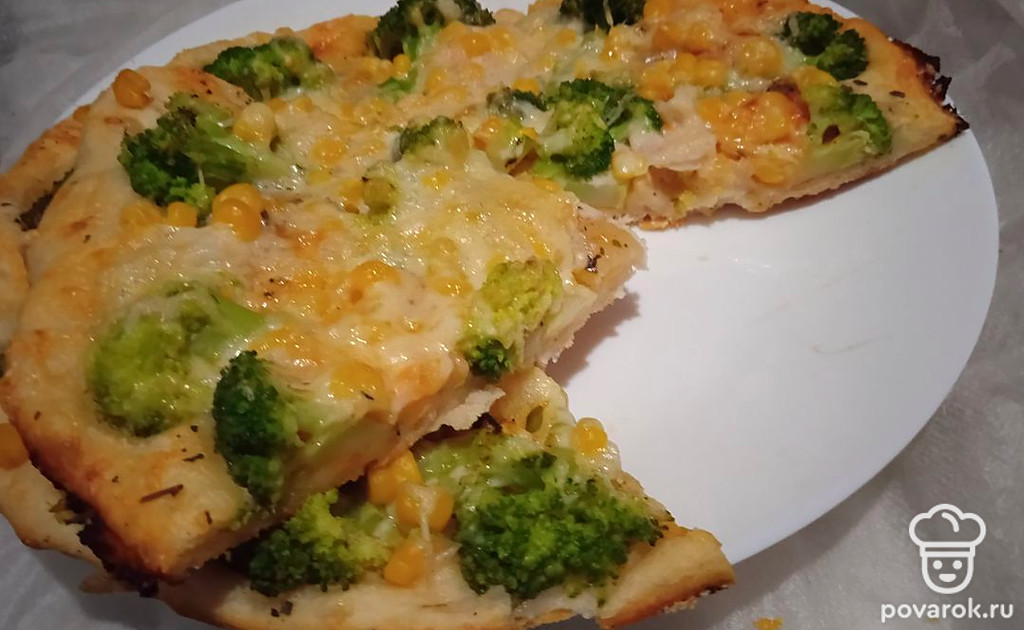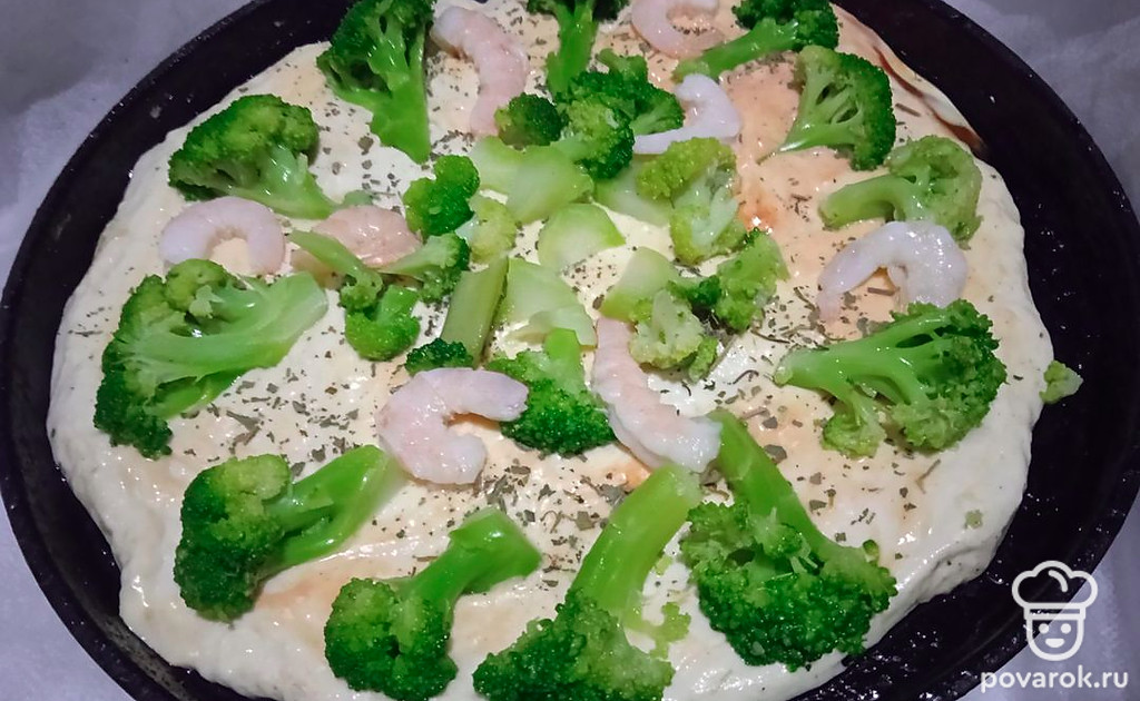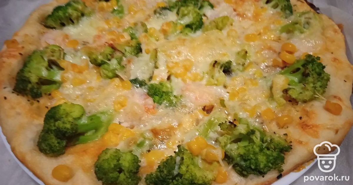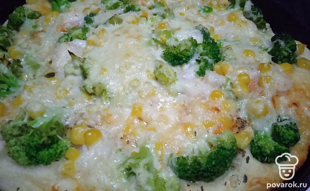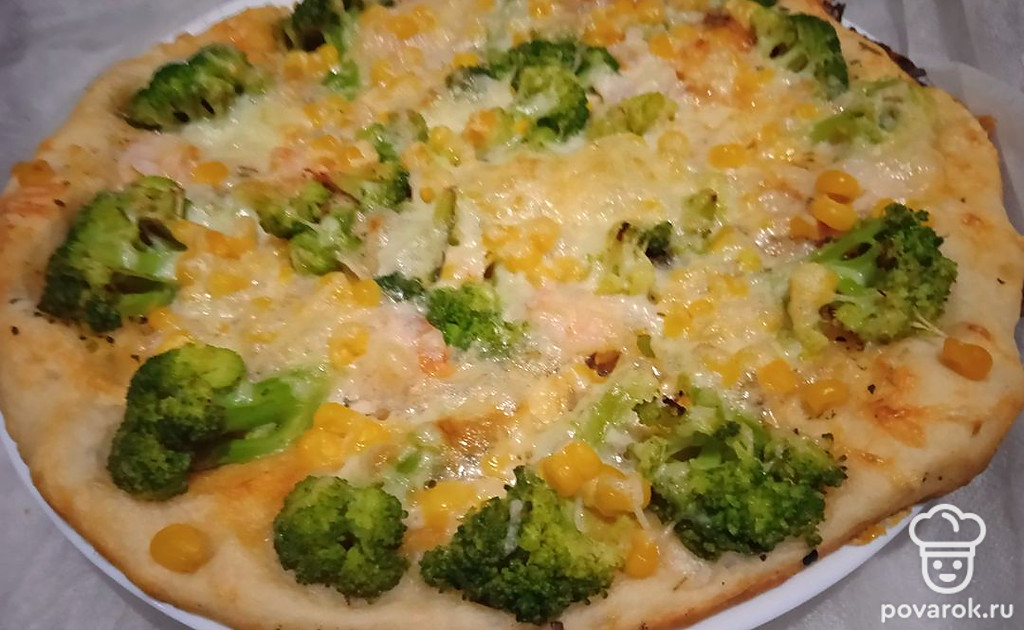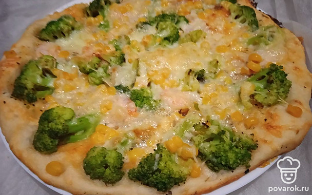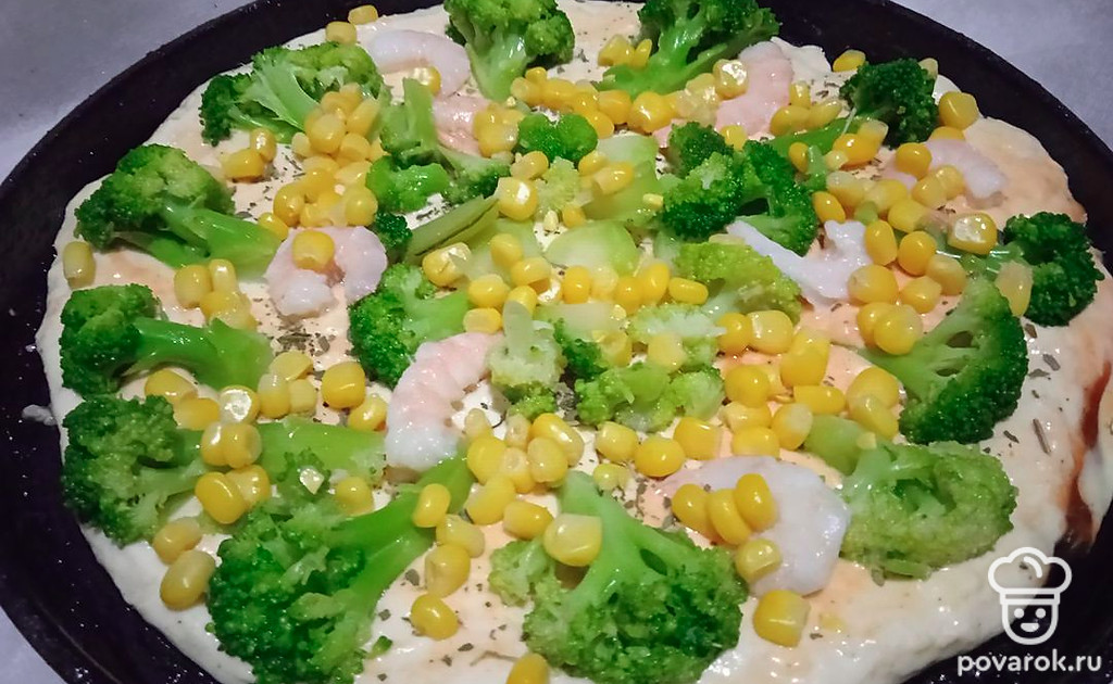 Пицца с брокколи, креветкой и кукурузой