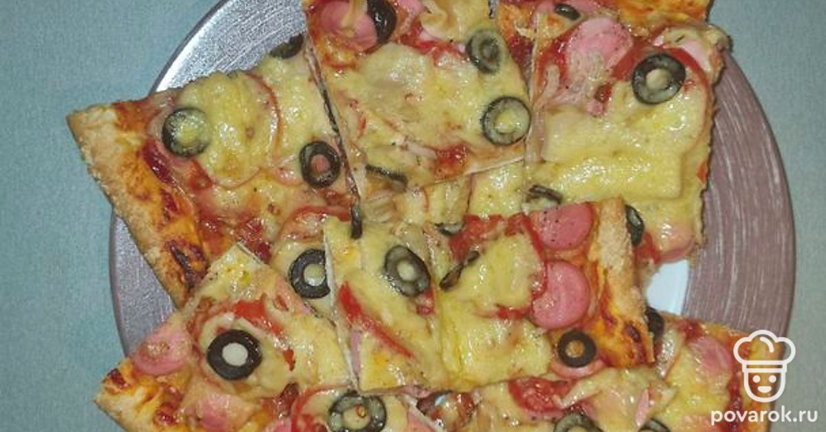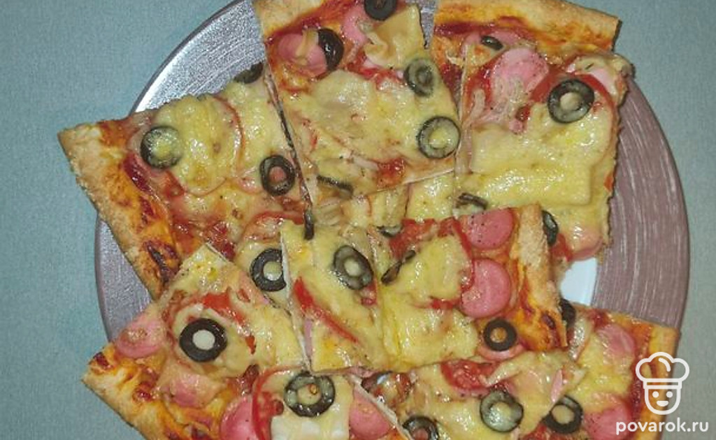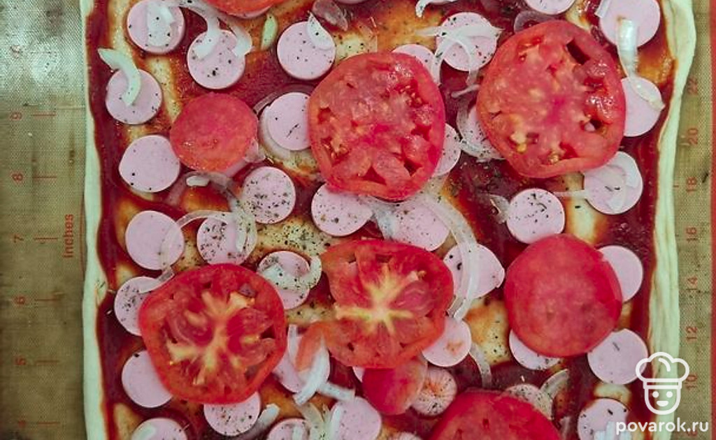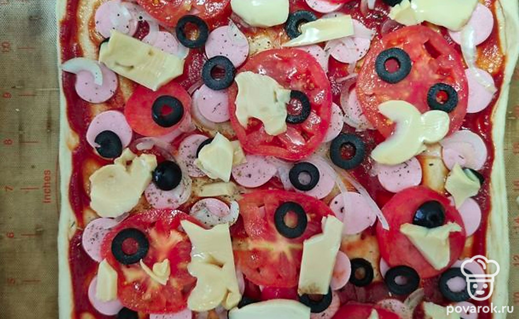 Готовим начинку. Сосиски и помидоры нарезаем кружочками, лук — полукольцами, маслины тоже режем кружочками. Выкладываем начинку на основу. Солим и перчим по вкусу. Можно добавить сушеные прованские травы.