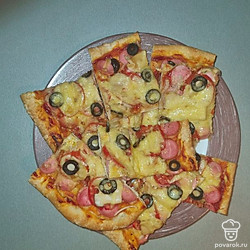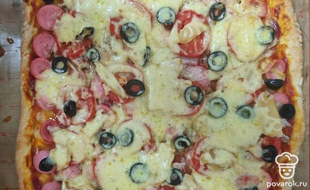 Разогреваем духовку до 200 градусов и ставим пиццу выпекаться на 15-20 минут. За 5 минут до готовности щедро посыпаем блюдо сыром. Приятного аппетита!