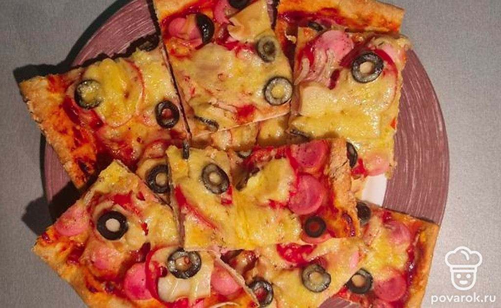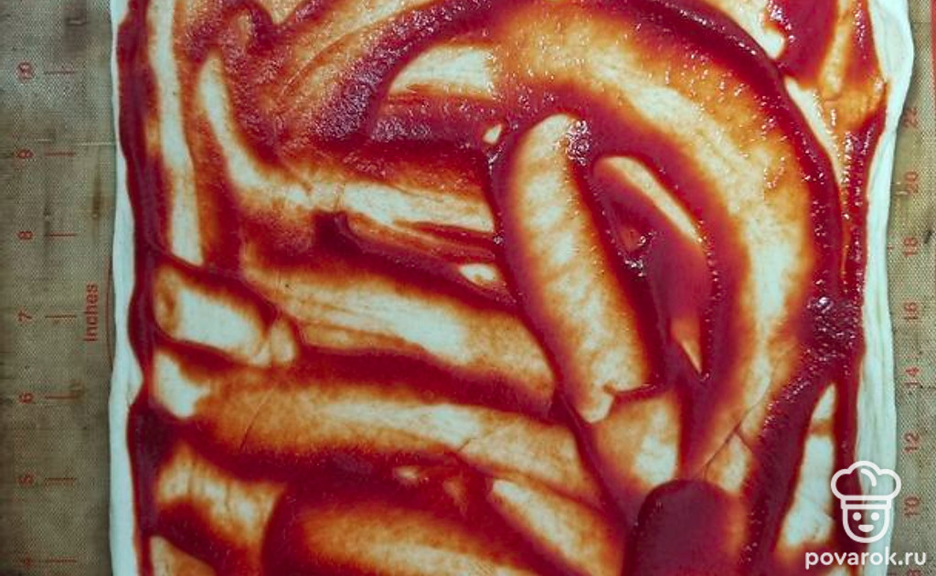 Смазываем основу для пиццы кетчупом или томатной пастой.