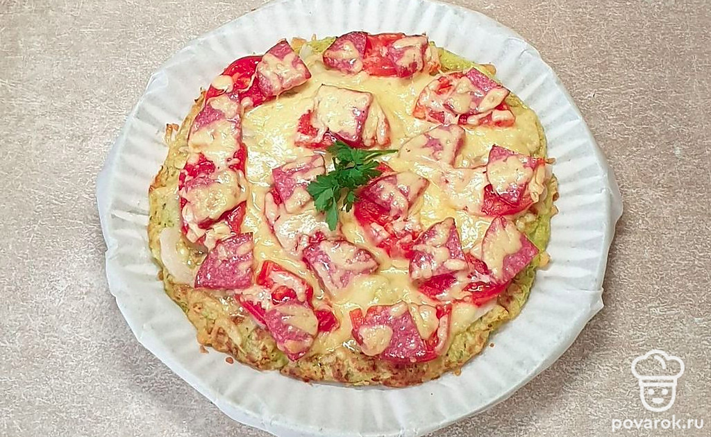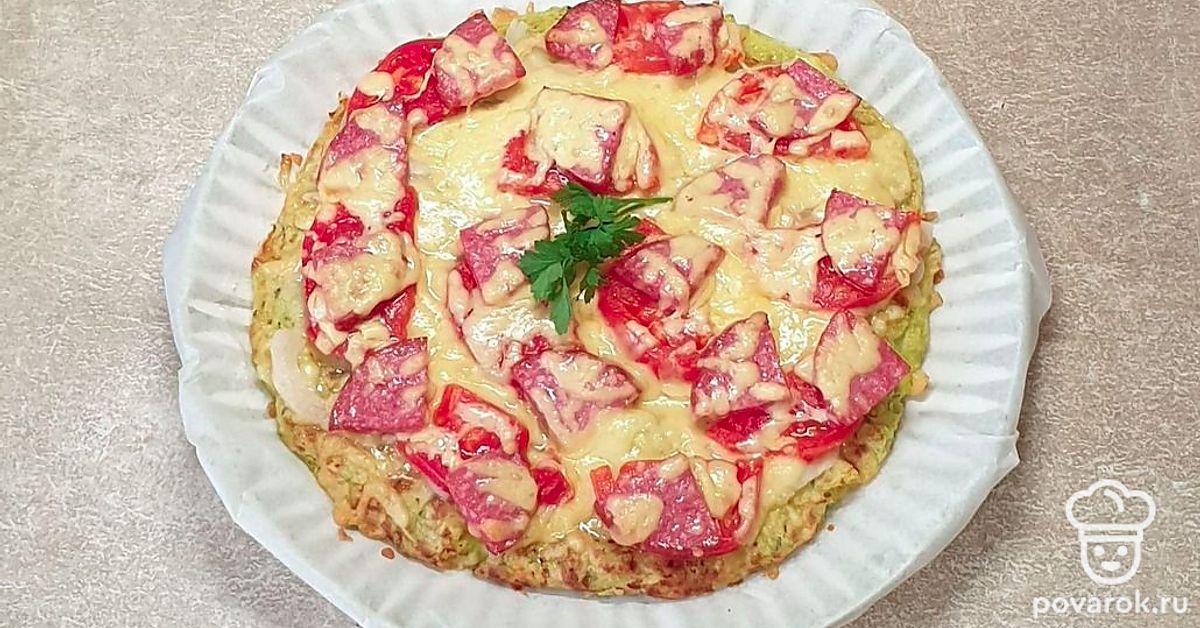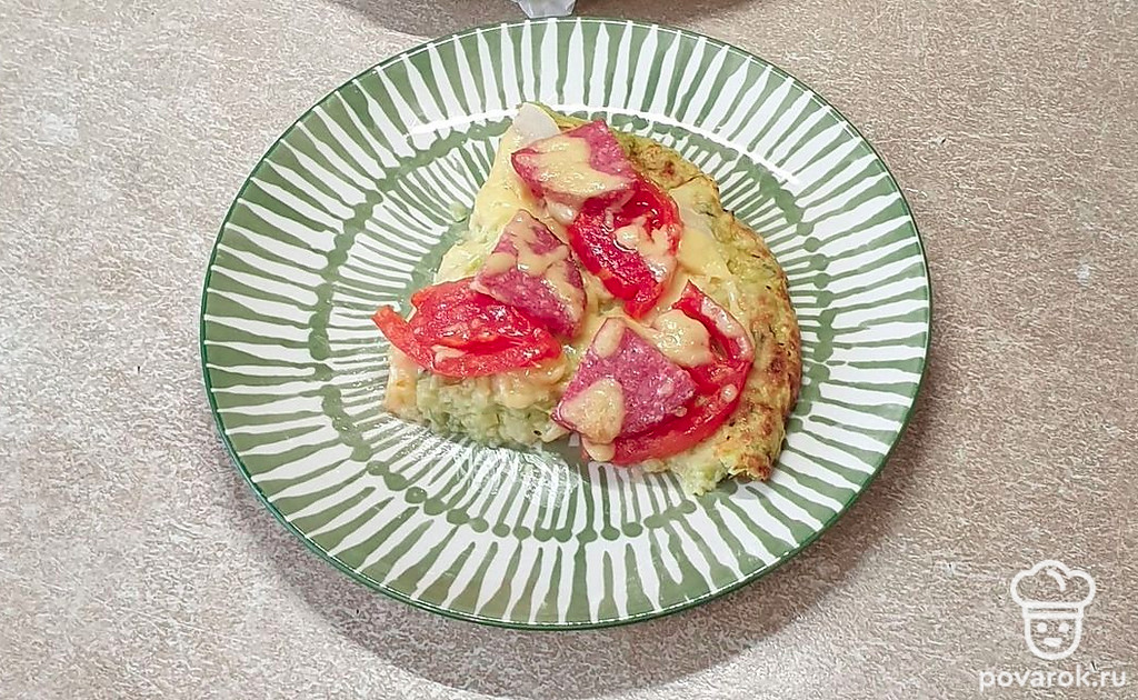 Кабачковую пиццу подавайте горячей, нарезав на порционные кусочки. Приятного аппетита!