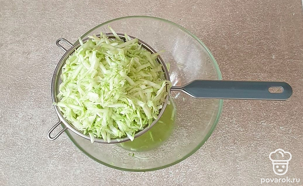 Кабачки натрите на крупной терке, посолите и перемешайте. Откиньте на сито, чтобы стекла лишняя жидкость. Оставьте на 10 минут.
