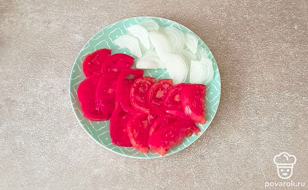 На помидоры выложите кусочки колбасы и тертый сыр. Выпекайте в заранее разогретой духовке при 200 градусах в режиме «верх-низ» 15-20 минут.