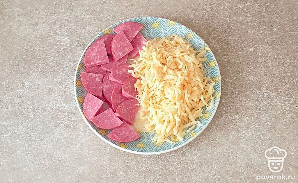Колбасу нашинкуйте кусочками, а сыр натрите на крупной терке.