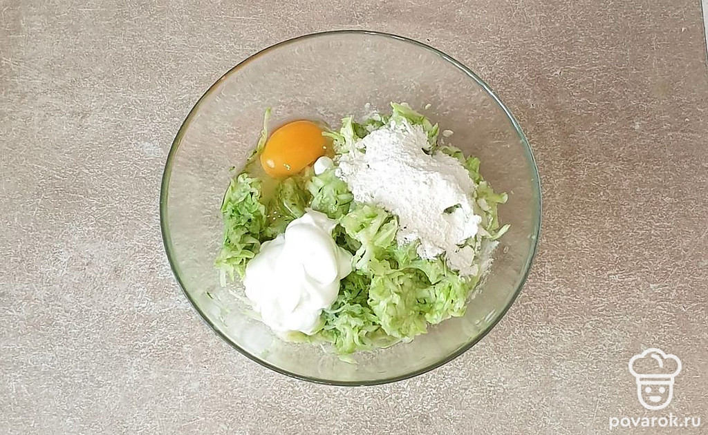 Кабачок выложите в глубокую миску. Добавьте яйцо, перец, сметану, муку и чеснок. Хорошо все перемешайте.