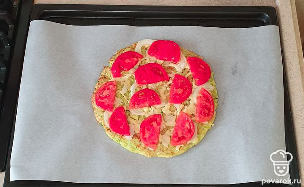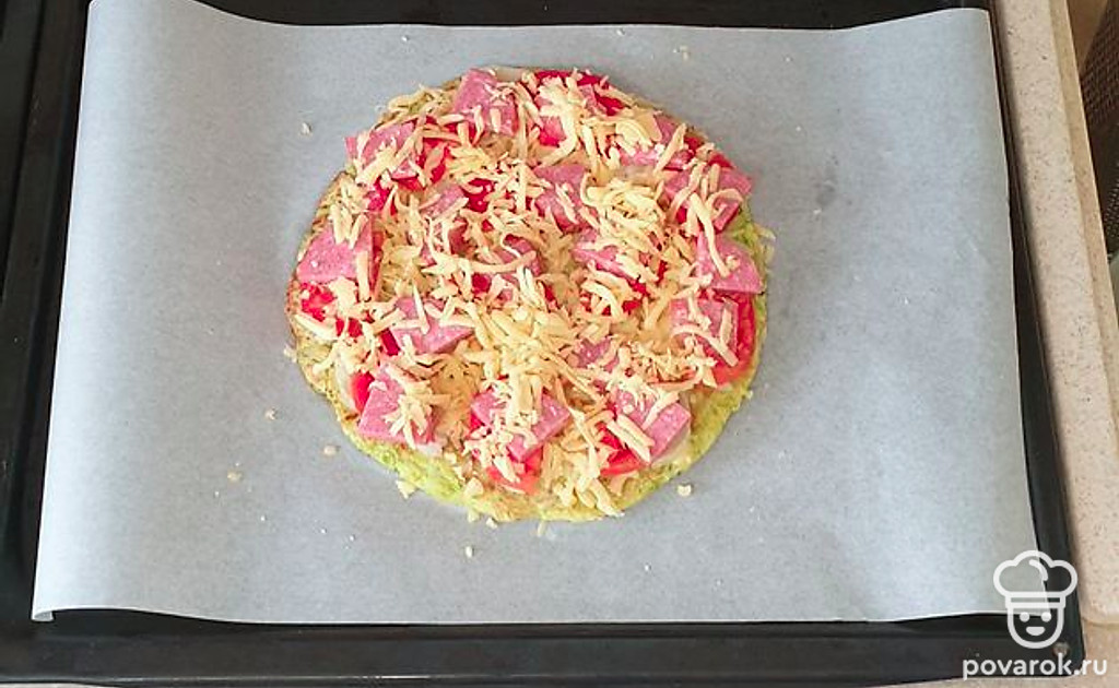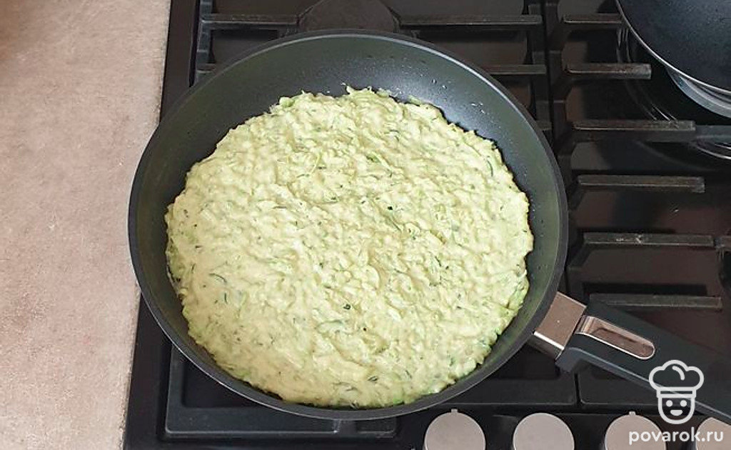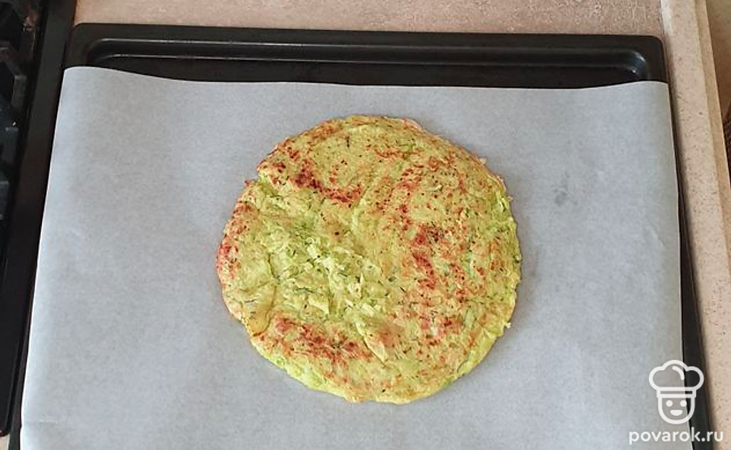 Сковороду смажьте растительным маслом и разогрейте. Выложите кабачковое тесто и разровняйте. Обжаривайте лепешку на небольшом огне с одной стороны. Затем основу для пиццы переверните и обжарьте еще пять минут. Можно накрыть крышкой.