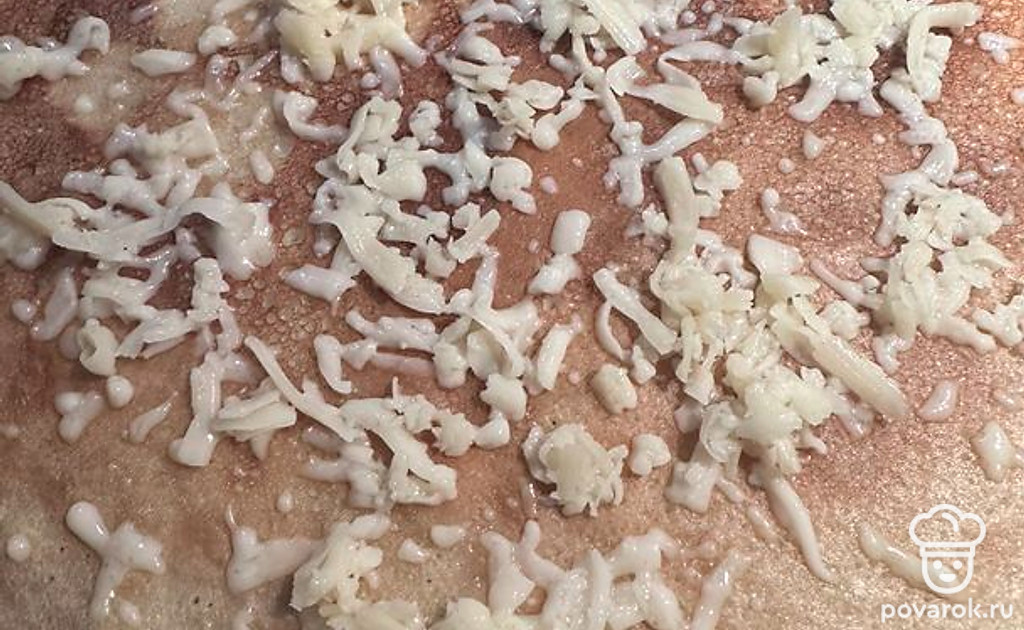 Блин переворачиваем и посыпаем сыром.