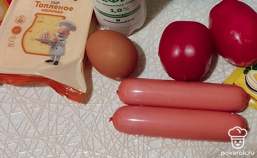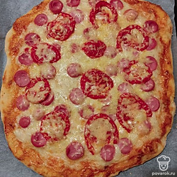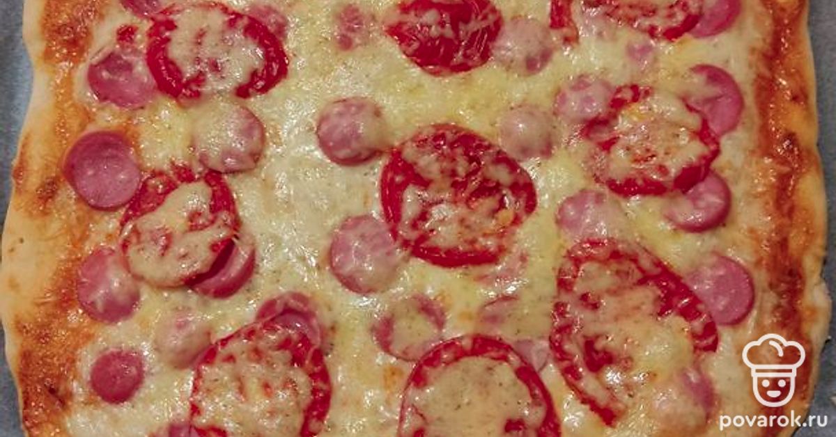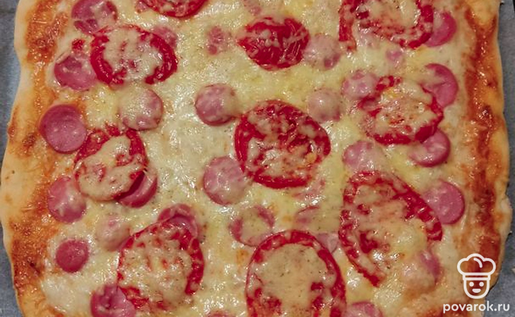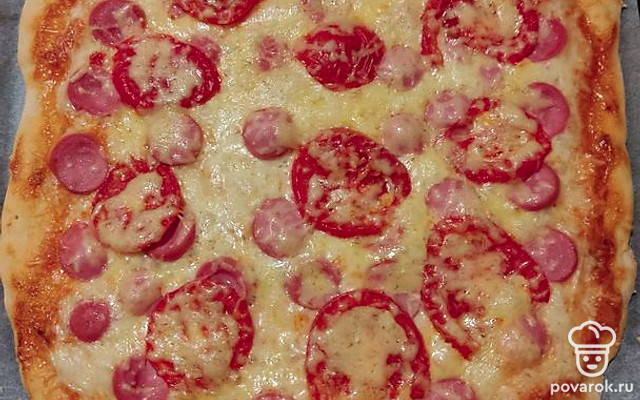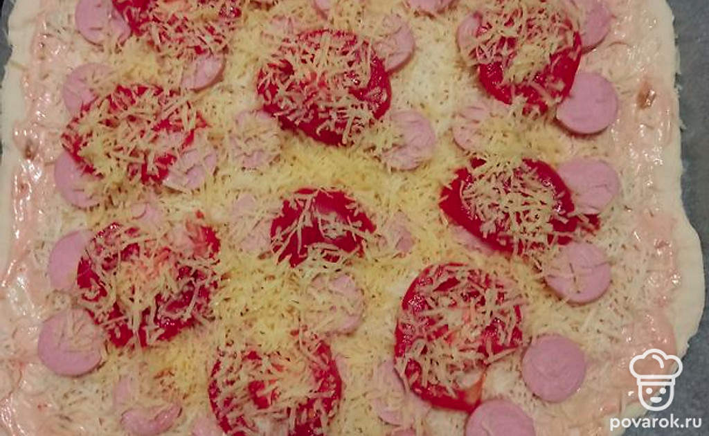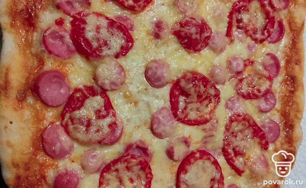 Выложим нарезанные кружочками сосиски и помидоры, посыпаем сыром. Ставим выпекаться в разогретую до 180 градусов духовку. Пицца печется около 30 минут. Готовность проверяем деревянной шпажкой: если она сухая, то пицца готова.