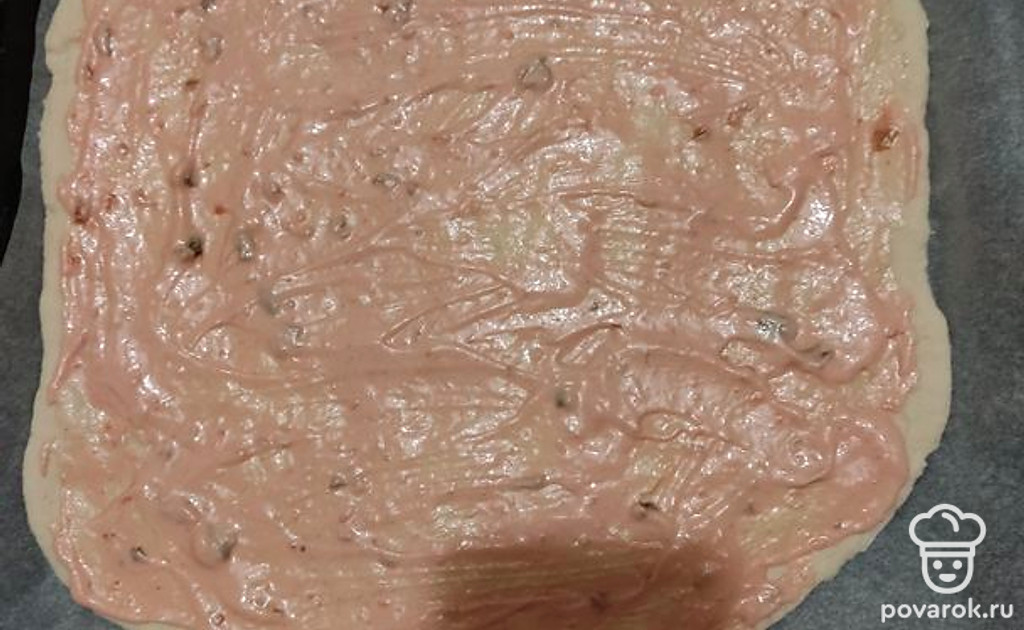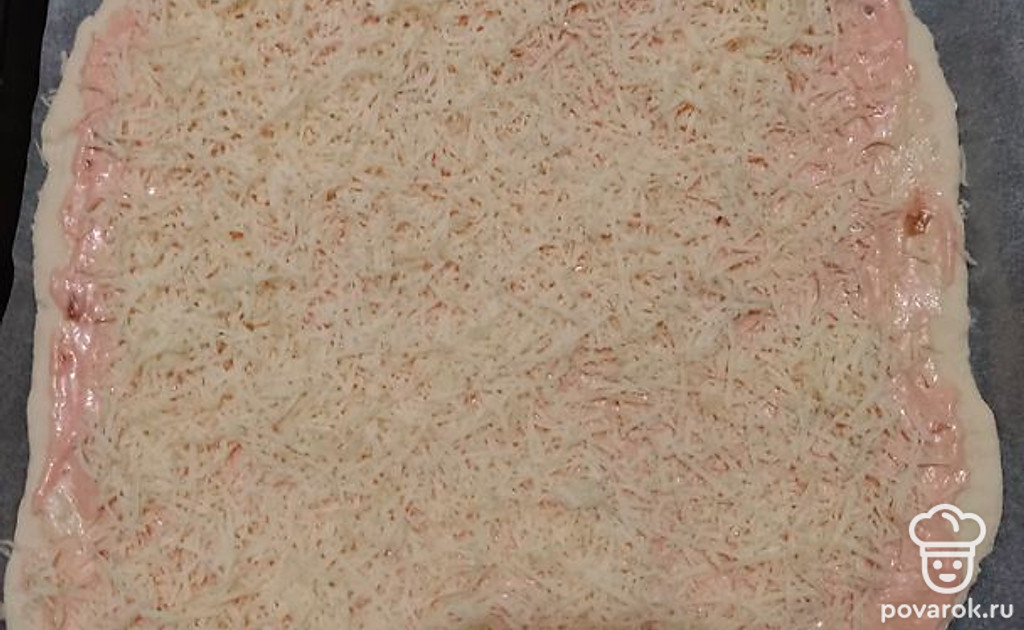 Раскатаем тесто и положим на противень. Смажем его майонезом с кетчупом или лечо.
