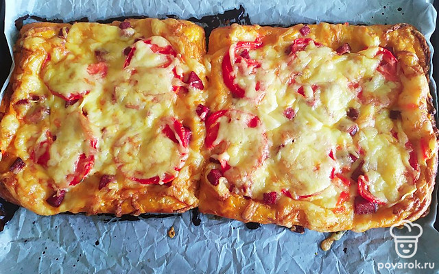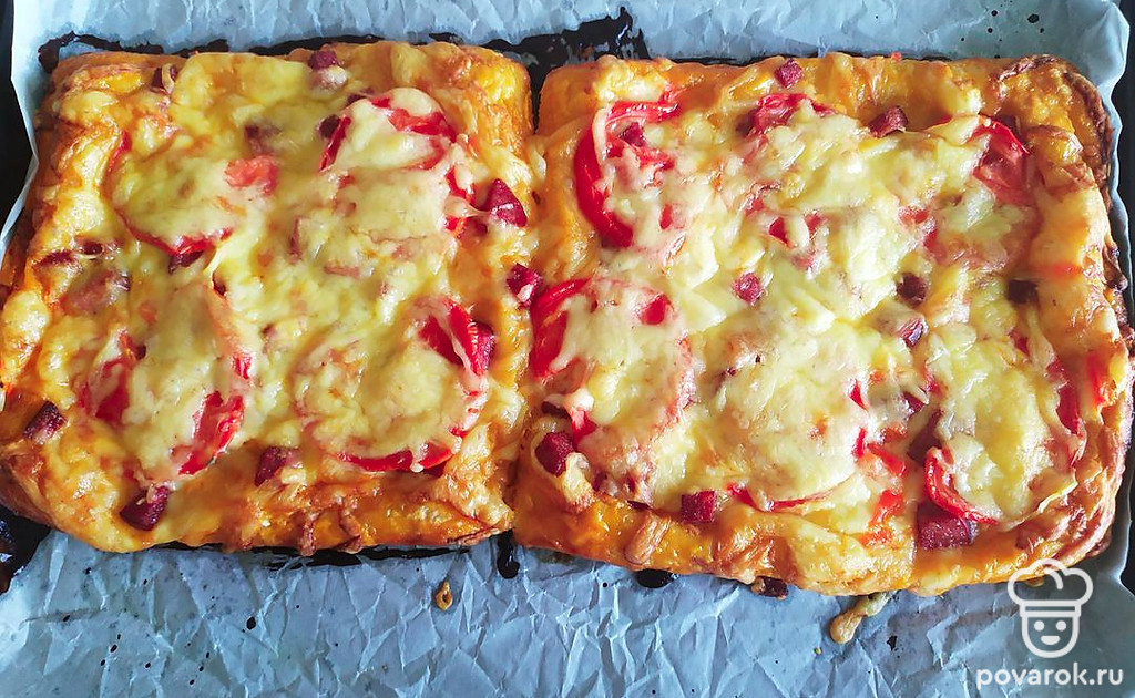 Все! Ленивая пицца готова. Можно менять соус по своему вкусу, добавлять курицу, ветчину, маслины, соленые огурцы. Все, что угодно. Результат будет превосходный.