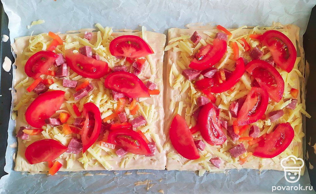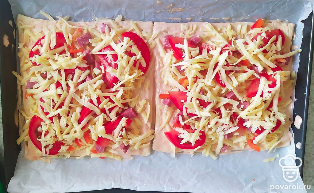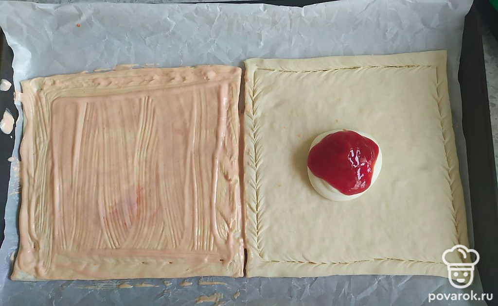 Разморозить слоеное тесто, выложить его на противень. Смазать тесто смесью из майонеза и кетчупа.