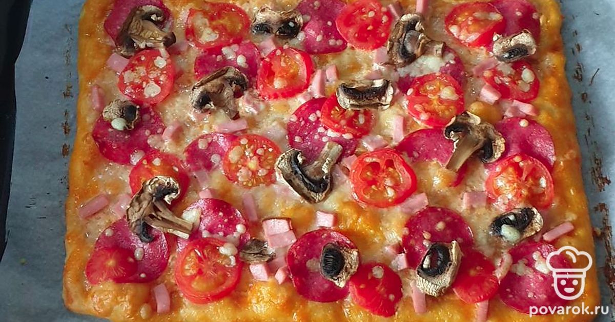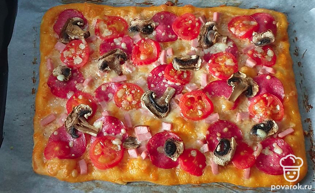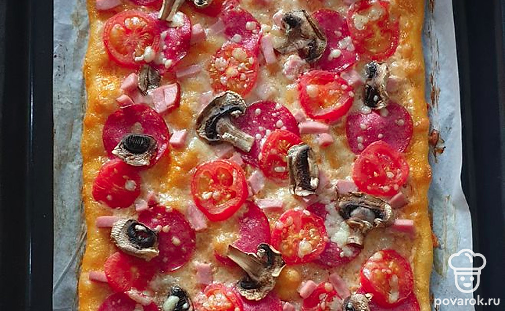 Пиццу подавайте порционно, нарезав на кусочки. Приятного аппетита!