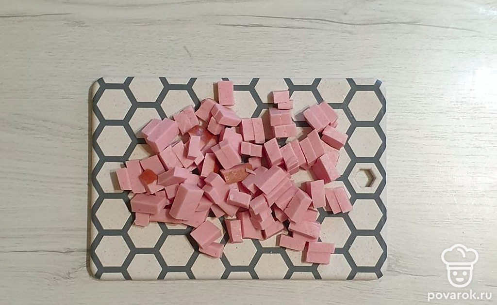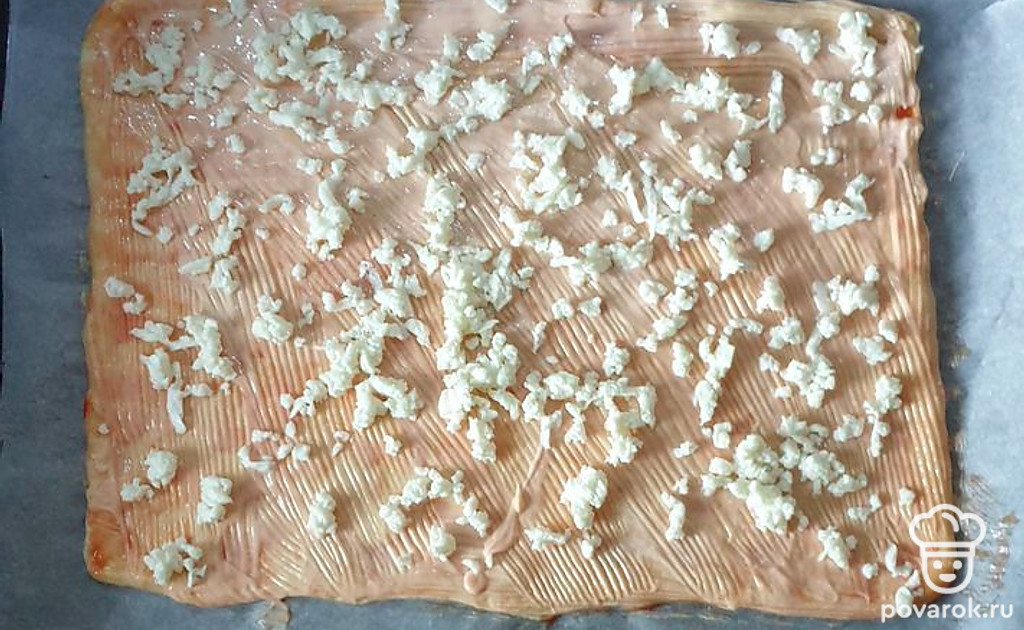 Приготовьте тесто, раскатайте его в пласт нужной формы и выложите на противень. Смажьте его майонезом, сверху посыпьте тертым сыром.