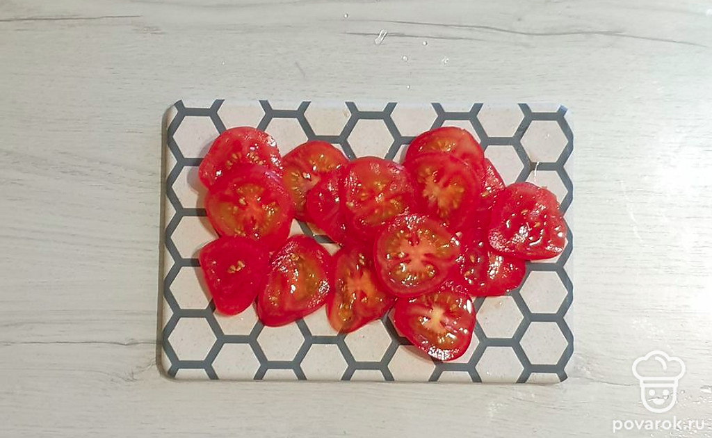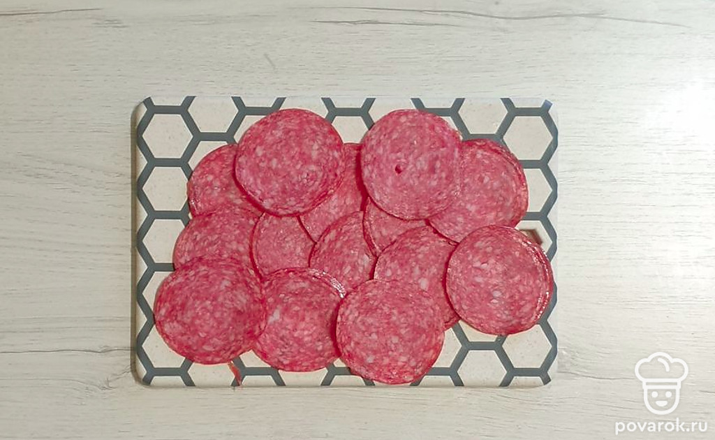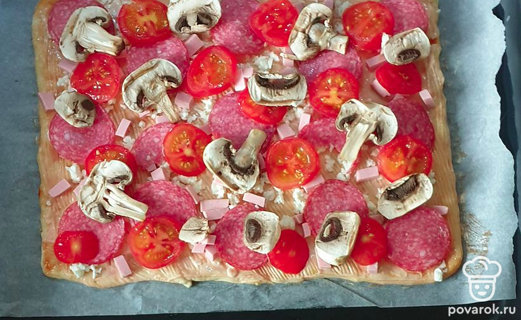 На тесто выложите все ингредиенты и выпекайте при 200 градусах в режиме «верх-низ» 20 минут.