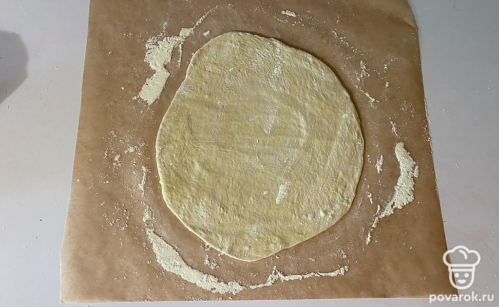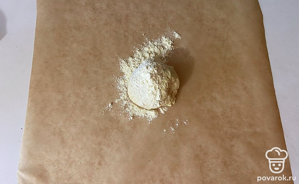На пергаментную бумагу выложите тесто и присыпьте его мукой.