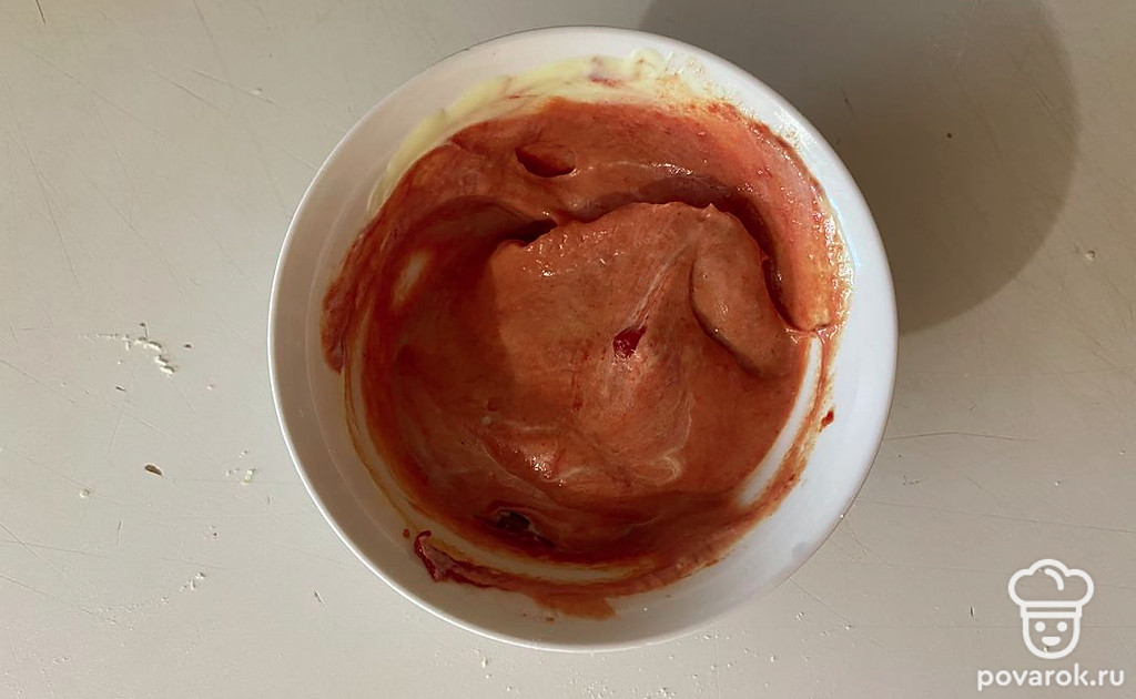 В отдельную посуду поместите томатную пасту и майонез, затем смешайте их между собой до однородности.