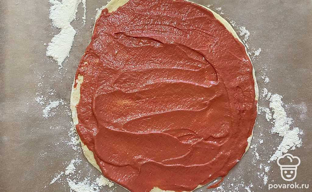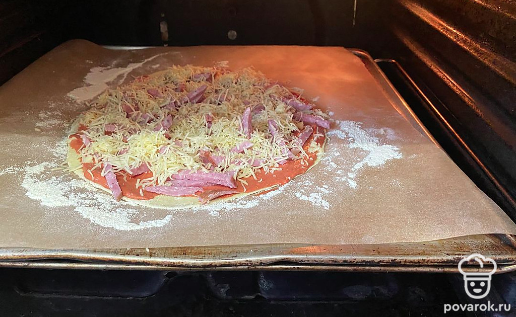 Затем переместите пергаментную бумагу с пиццей на форму для выпекания, отправьте ее выпекаться в духовку на 25 минут при 180 градусах.