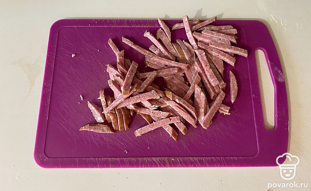 Для начинки нарежьте копчёную колбасу тонкими пластинками.