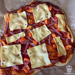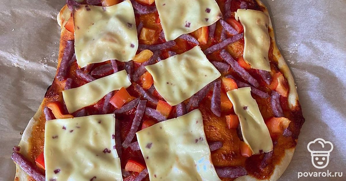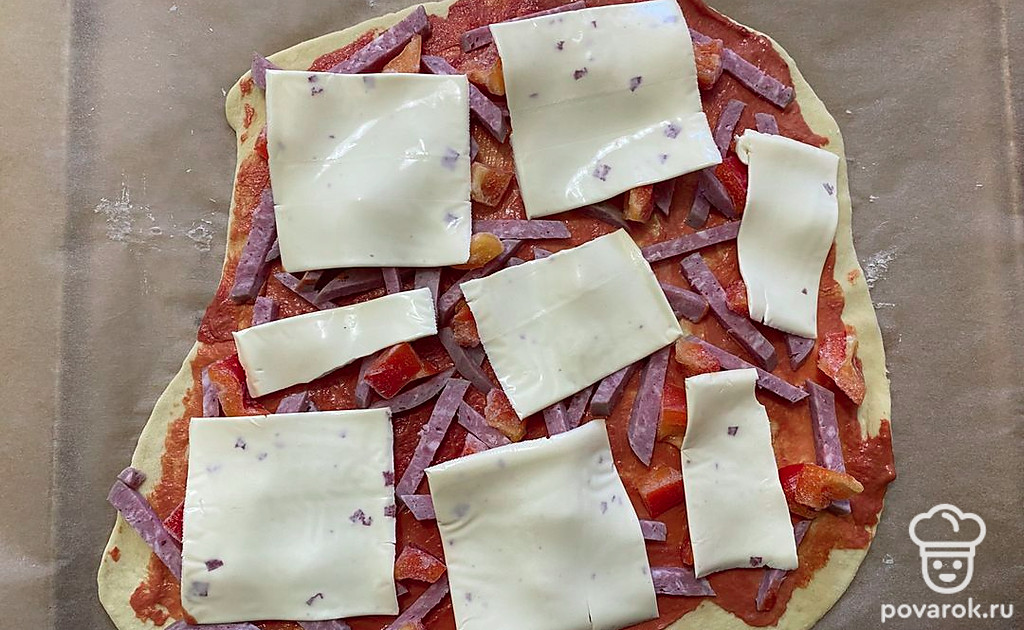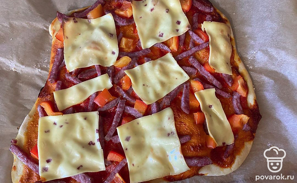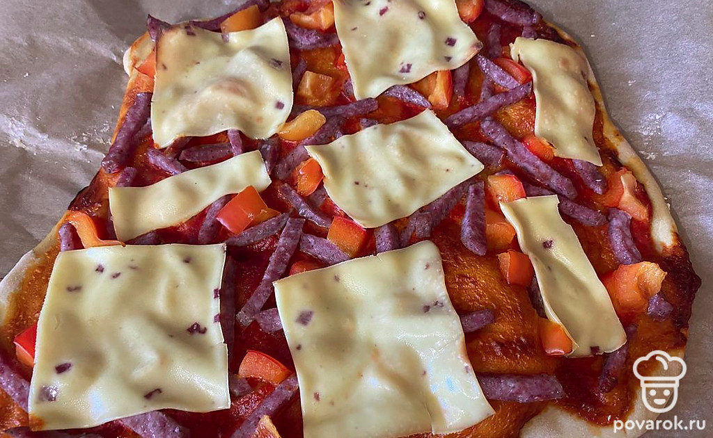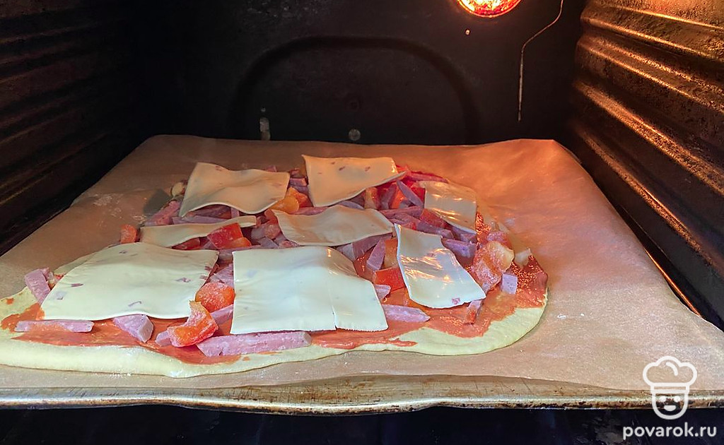 Будущую пиццу отправьте в духовку выпекаться на двадцать минут при 190 градусах.
