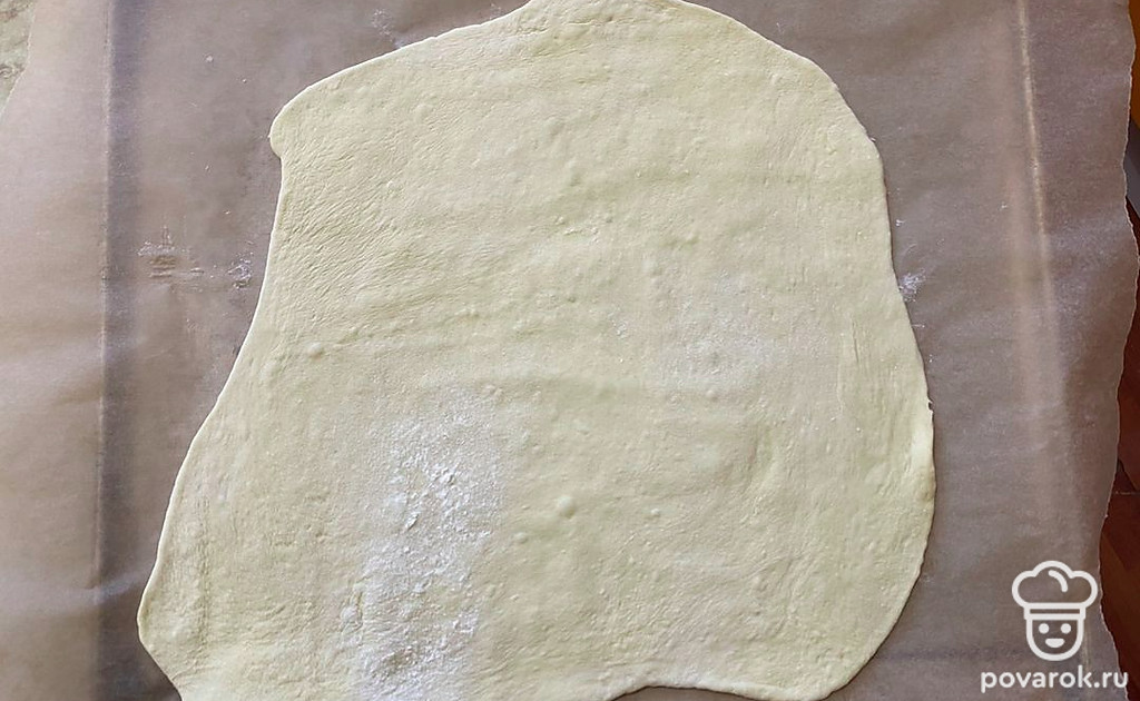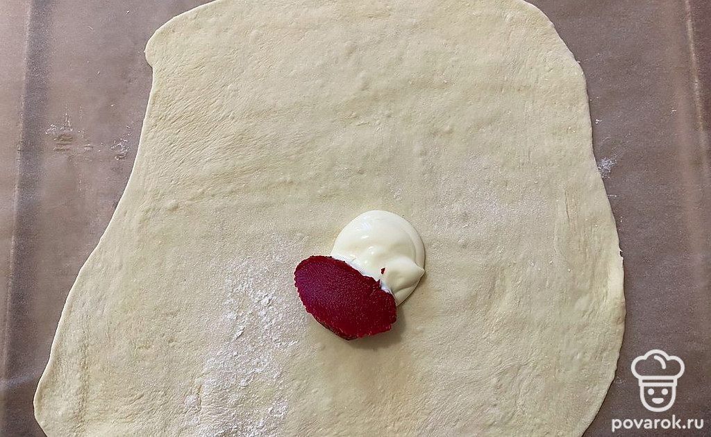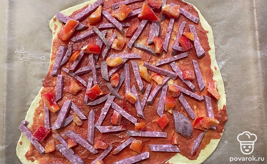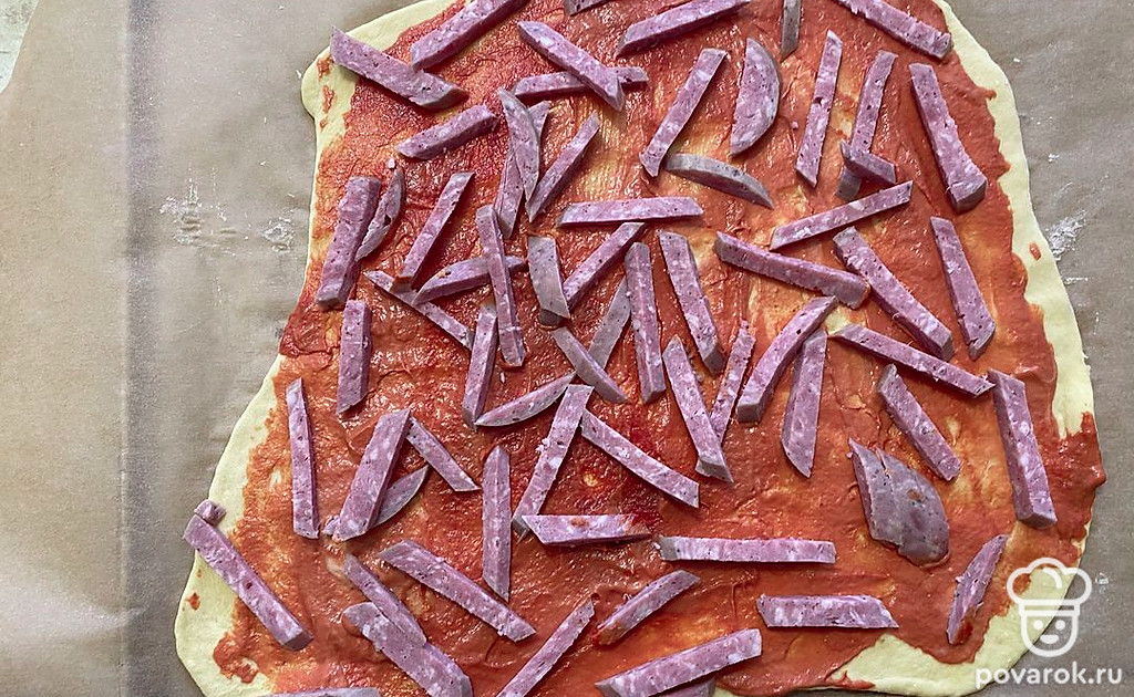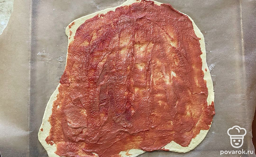 При помощи ложки перемешайте и размажьте соус по всему тесту.