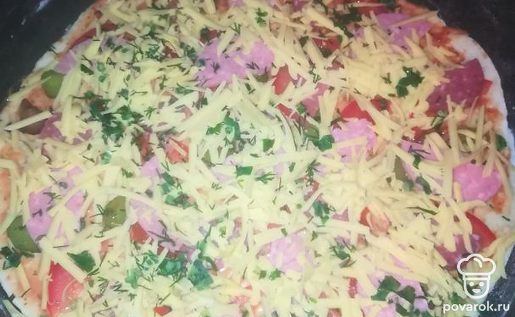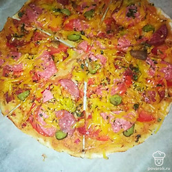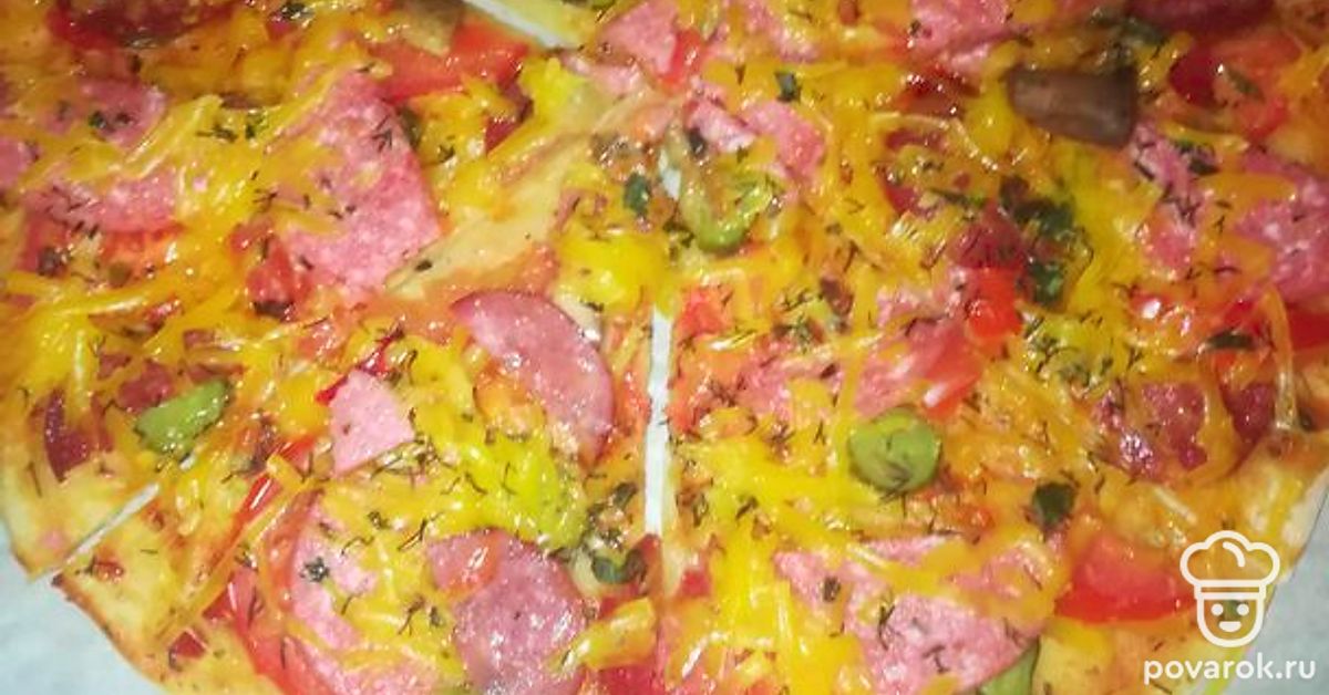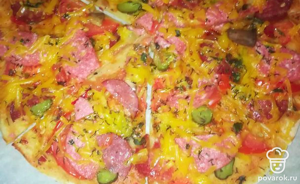 Раскатайте тесто в круг, переложите в форму для запекания, смажьте кетчупом, выложите начинку (колбаса, оливки, грибы, помидоры,сыр). Выпекайте в духовке при температуре 220 градусов 25 минут.