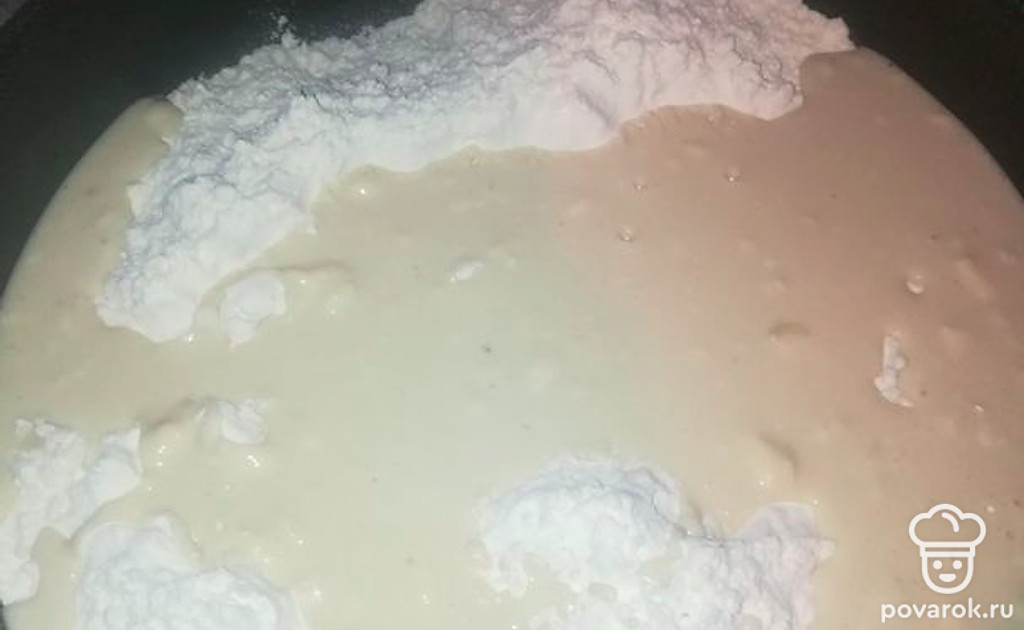 В муку добавьте рассол, майонез, сахар, соль, разрыхлитель.