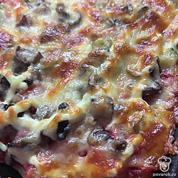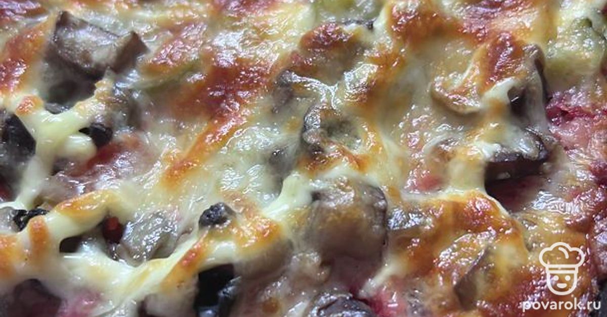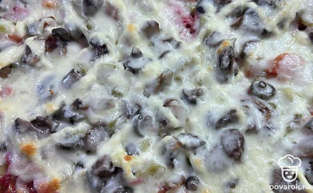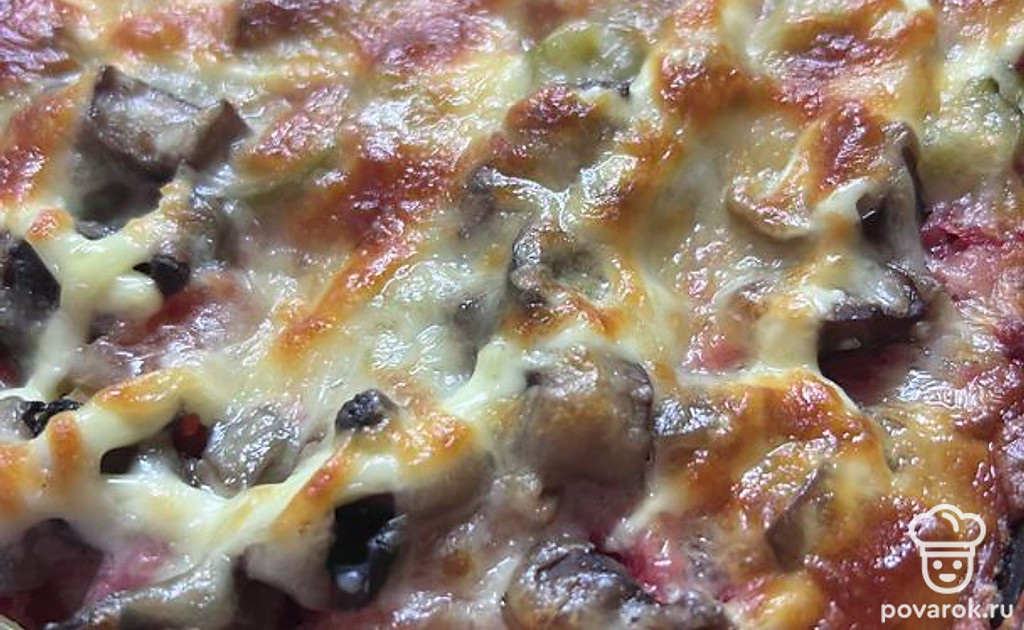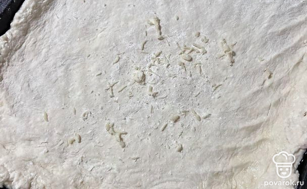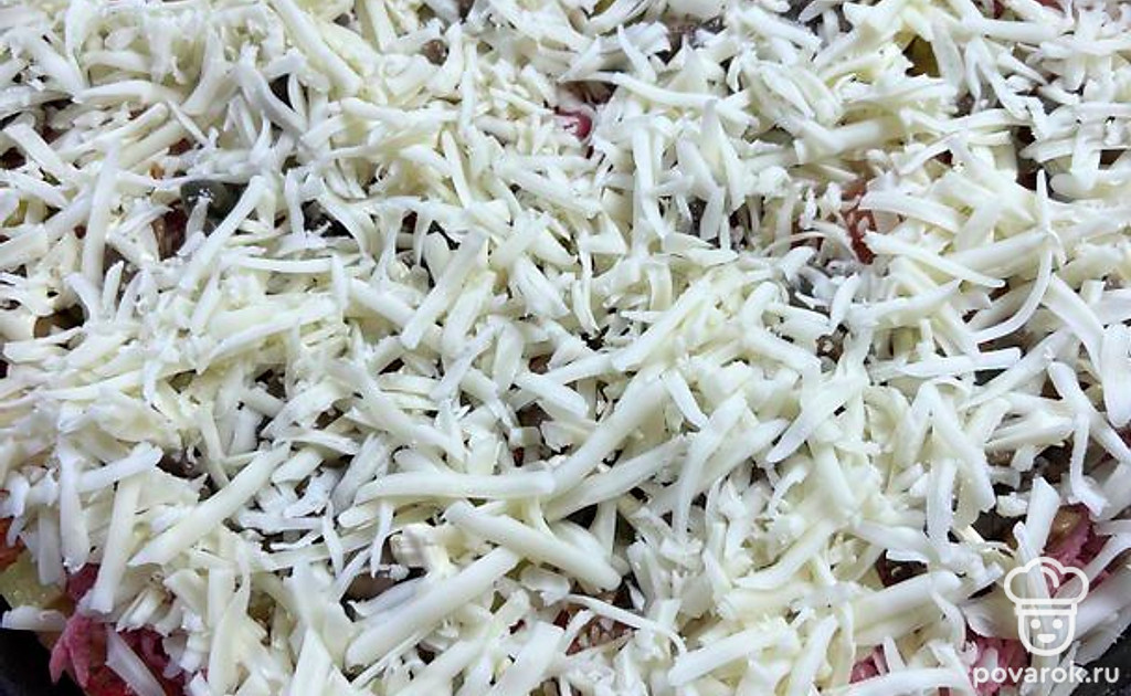 В финале натираем сыр. Пиццу закрываем сыром, убираем в духовку на 35-40 минут при 180 градусах.
