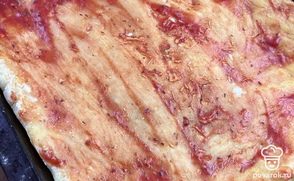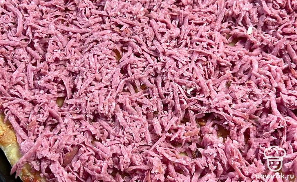 Поверх теста с кетчупом выкладываем колбасу, крупно натертую на терке.