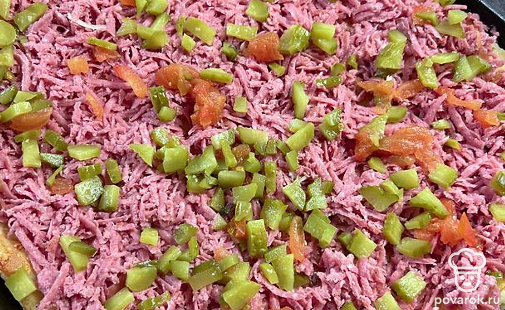 Поверх колбасы раскладываем нарезанные соленые огурцы.