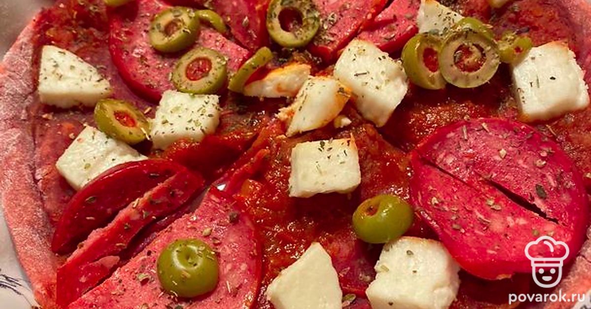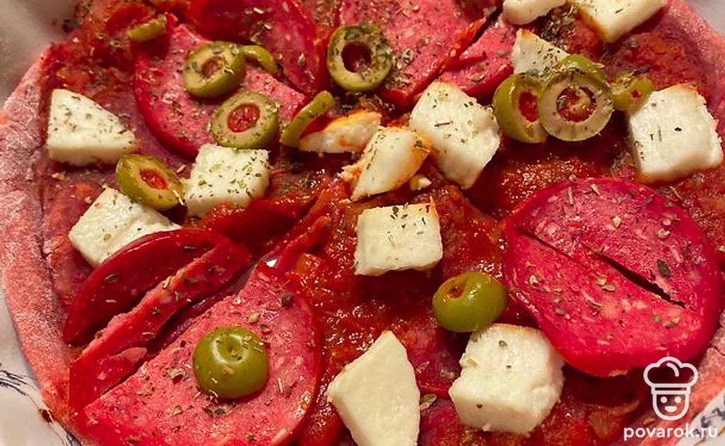 Помешивать до загустевания. Намазать раскатанную основу соусом, сверху добавить колбасу, адыгейский сыр, посыпать орегано. Выпекать в духовом шкафу на 200 градусах около 13 минут, в режиме «конвекция».