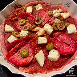 Просеять муку и смешать ее с солью. Часть, примерно 1/5 стакана, отложить, чтобы добавить после замеса, если тесто того потребует. Сделать углубление в муке, вылить туда оливковое масло и воду пополам со свекольным соком. Замесить мягкое тесто.