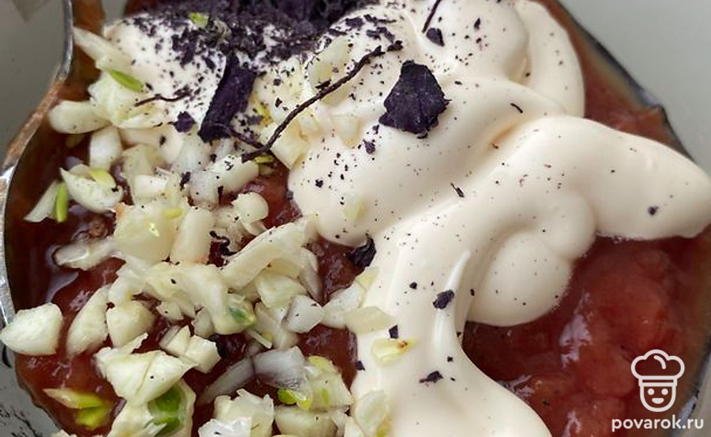 Для соуса смешать томатную пасту, майонез, чеснок, сушеный базилик.