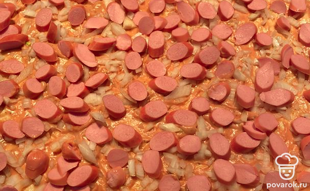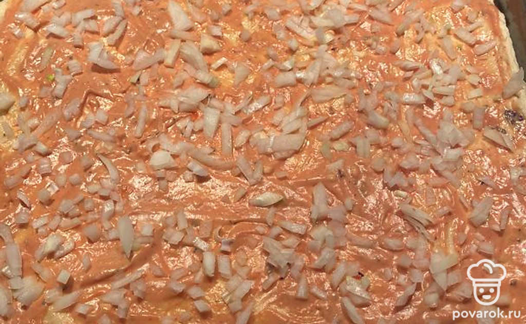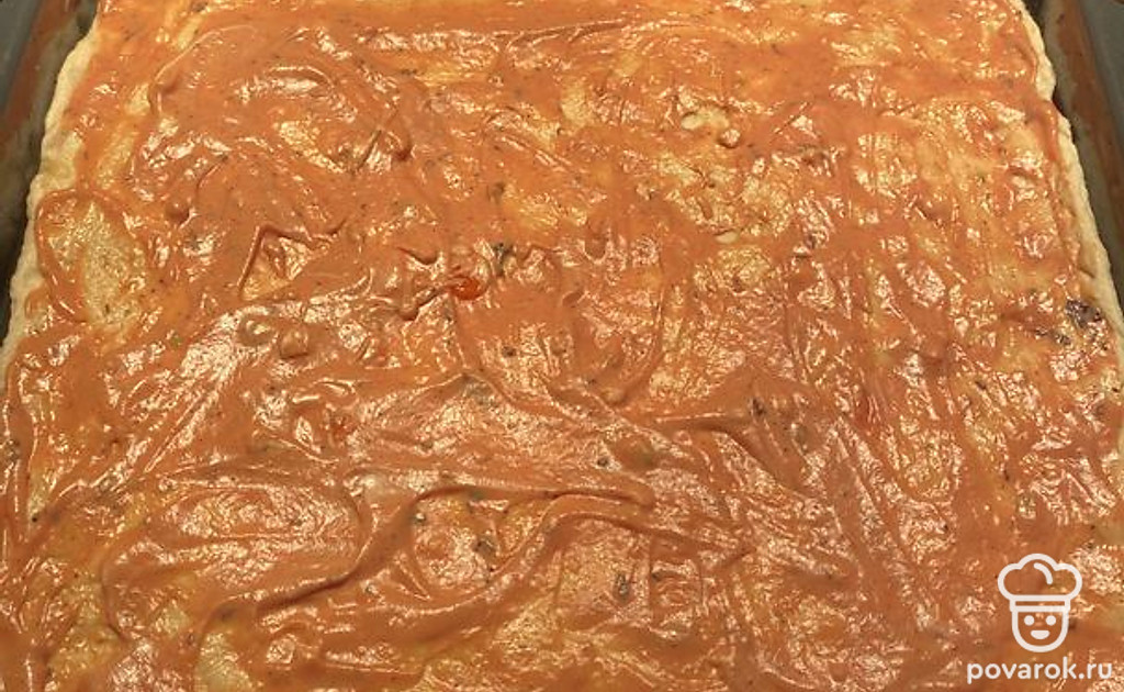 Распределить тесто тонким слоем по противню, смазать соусом.