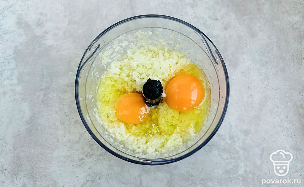 Добавьте яйца, соль и черный молотый перец. Взбейте блендером еще раз.