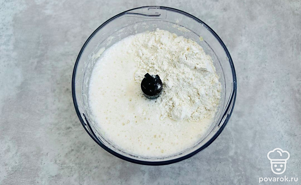 Введите муку и воду, еще раз взбейте. Тесто должно получиться не жидким.