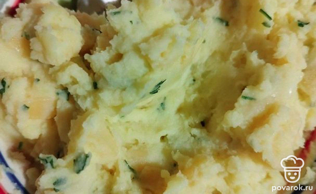 Картофельное пюре смешиваем с натертым сыром и любой зеленью. У меня укроп и петрушка.