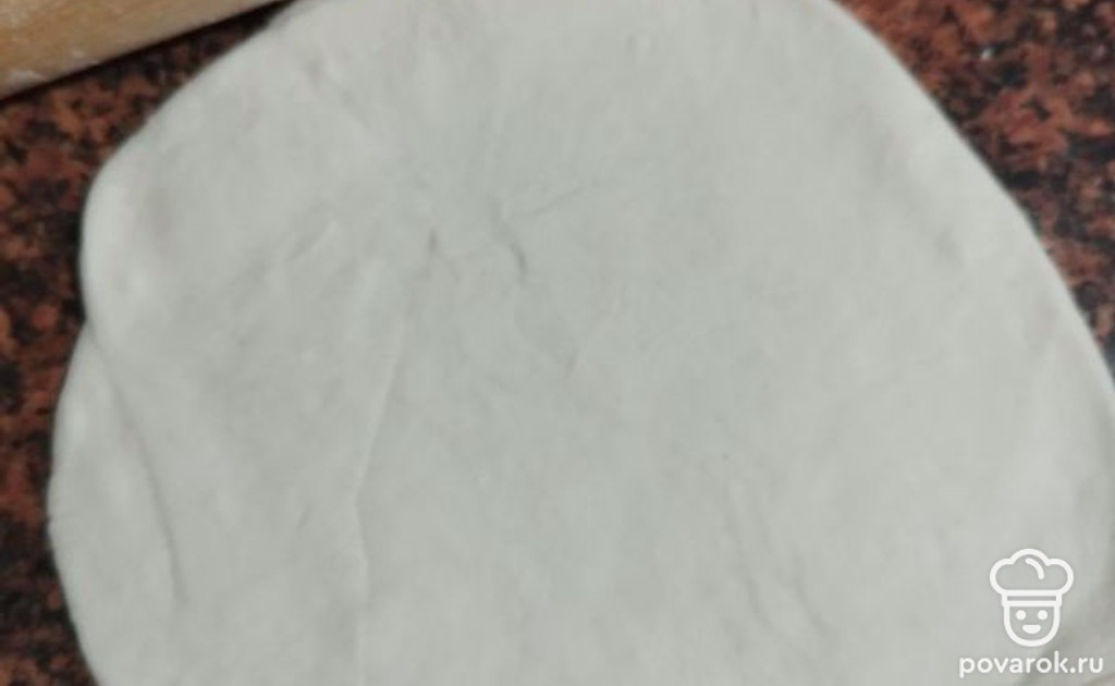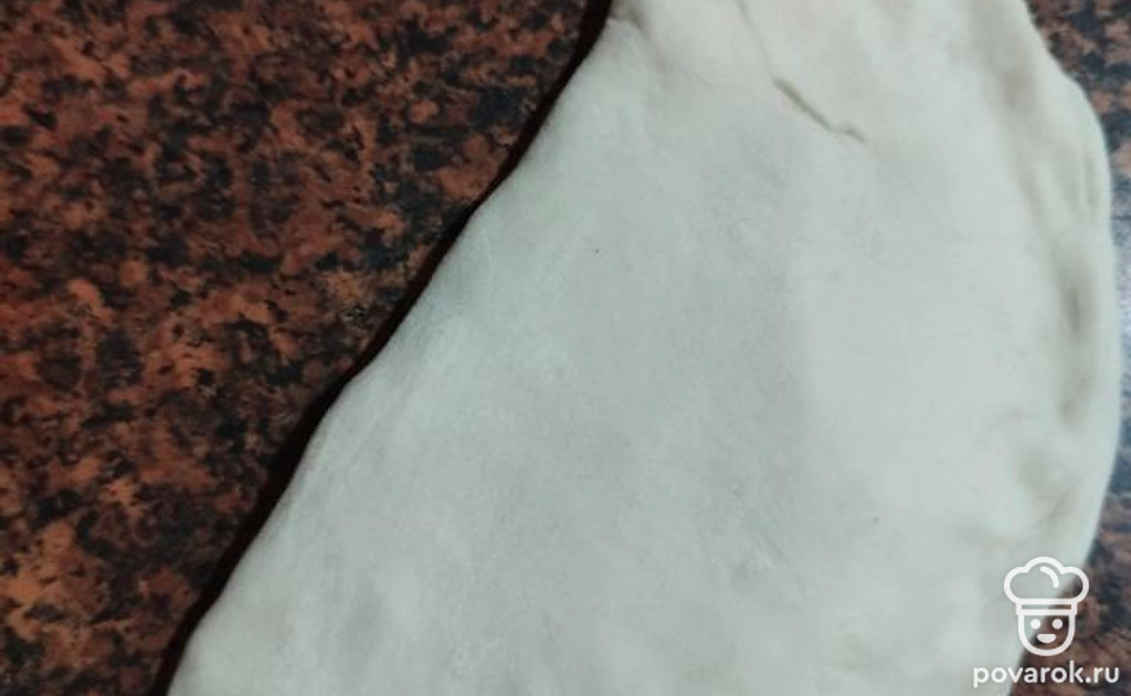 Готовое тесто делим на 6-8 кусочков. Раскатываем кружок, кладем начинку на одну половину, оставляя место для склеивания теста.