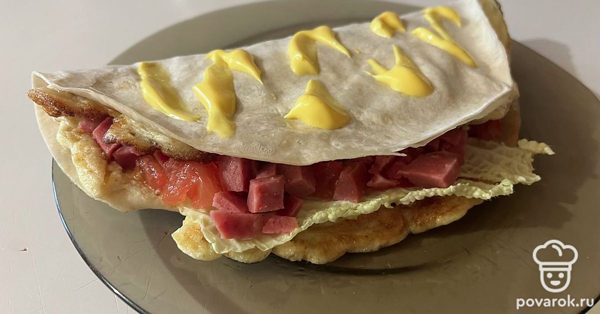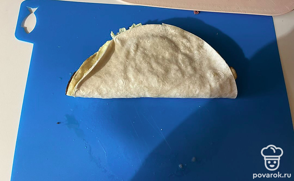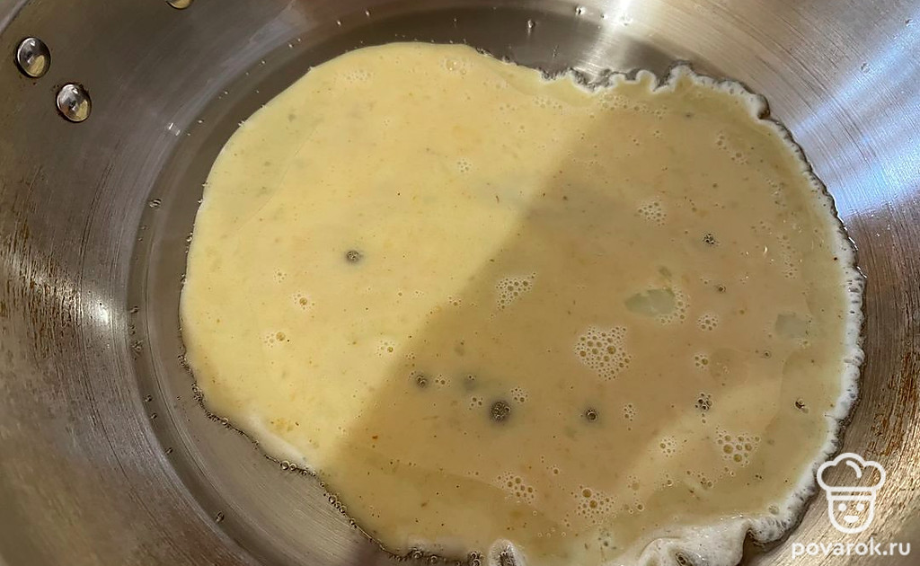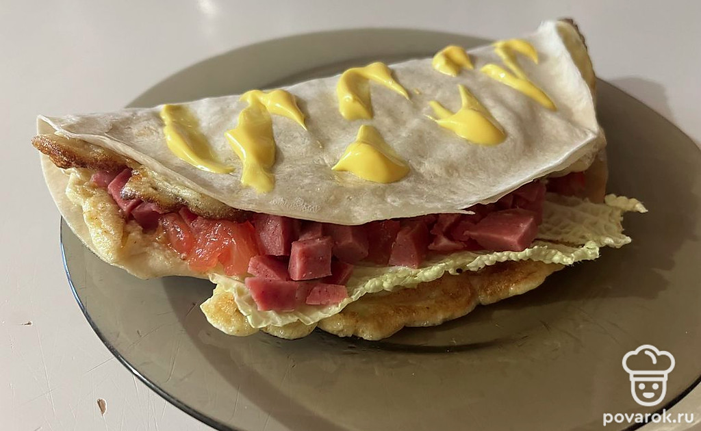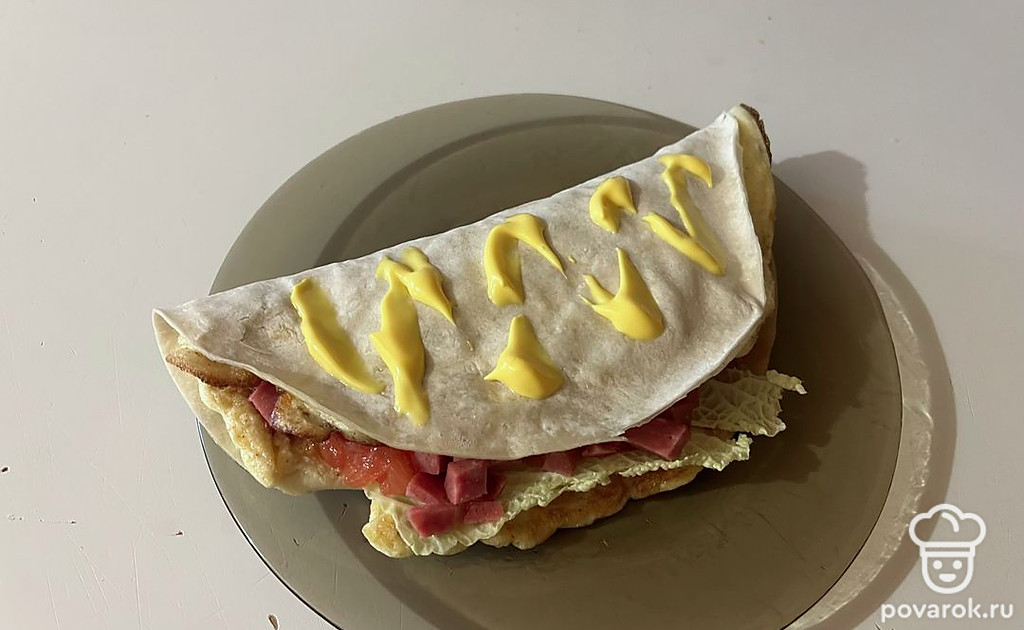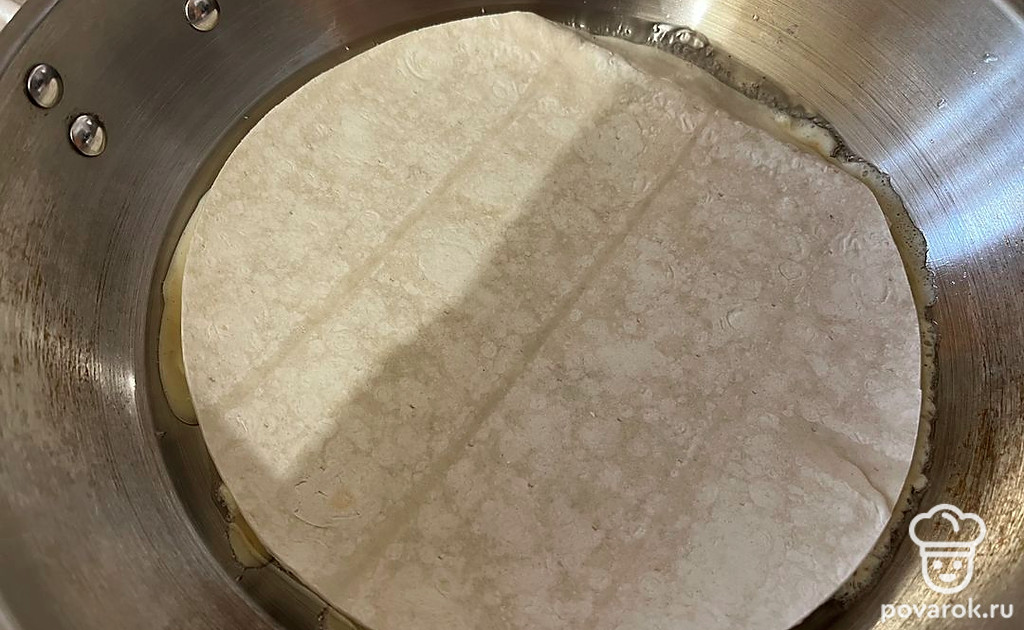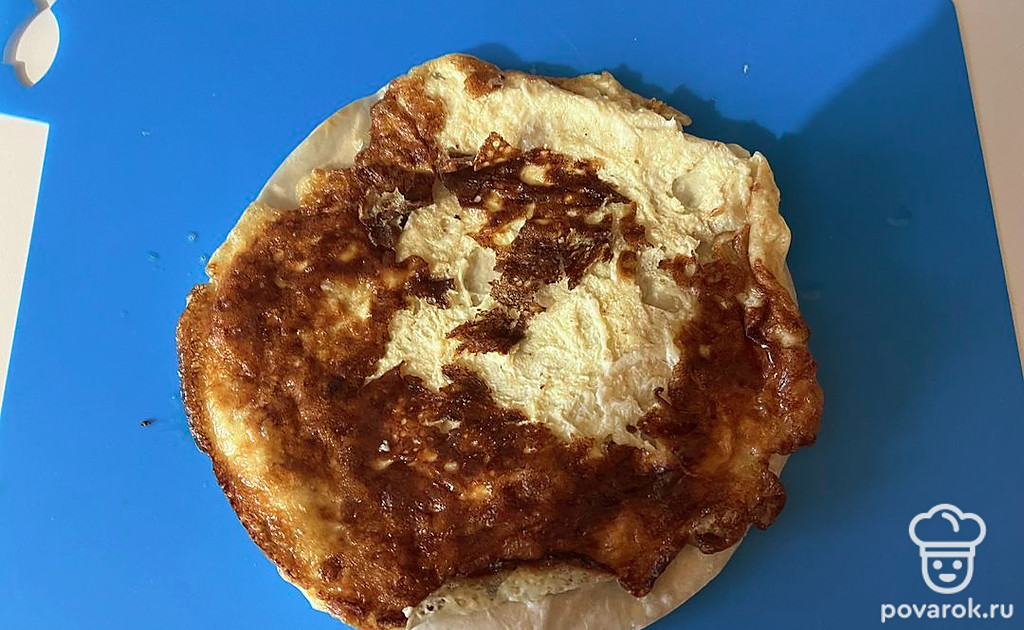 Яичную смесь накройте лавашем. Обжаривайте продукты до готовности яичной смеси, примерно 5 минут.