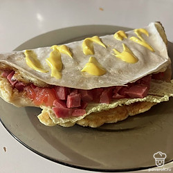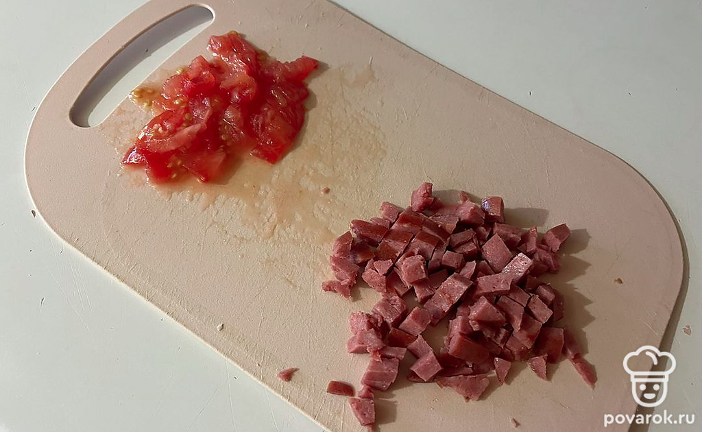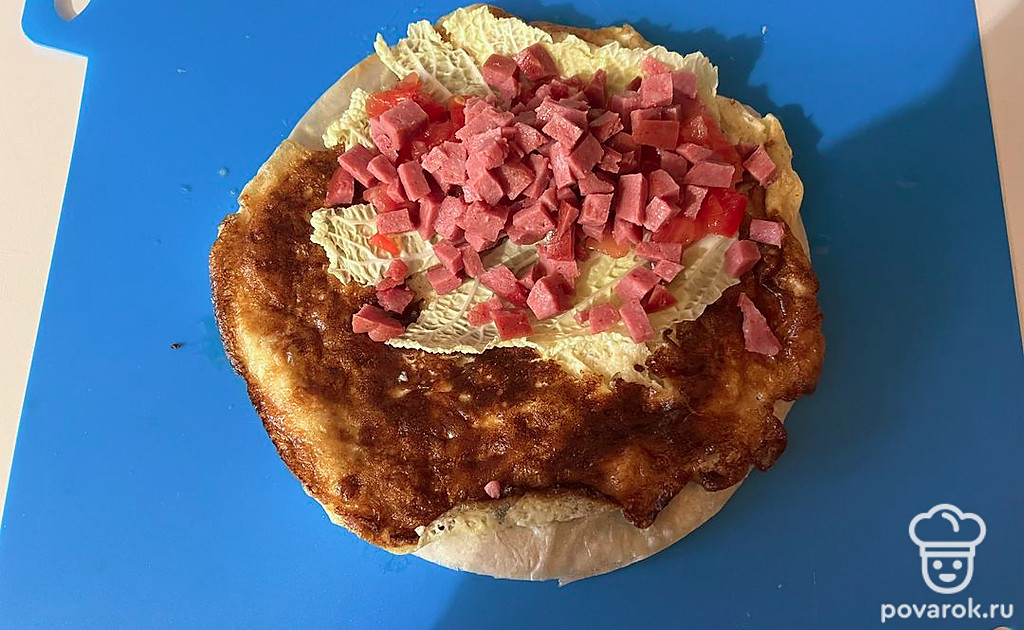 На 1/2 часть лепешки выложите начинку из салата, помидора и колбасы.
