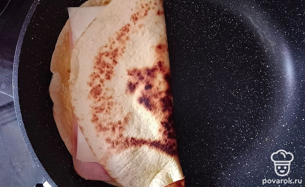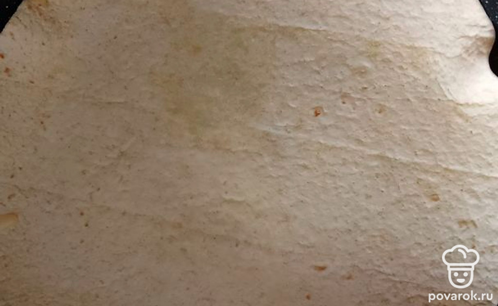 Сверху, пока яйцо не схватилось, накройте его тортильей. Можно немного покрутить лепешку на сковороде, чтобы распределить яйцо.
