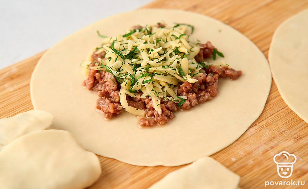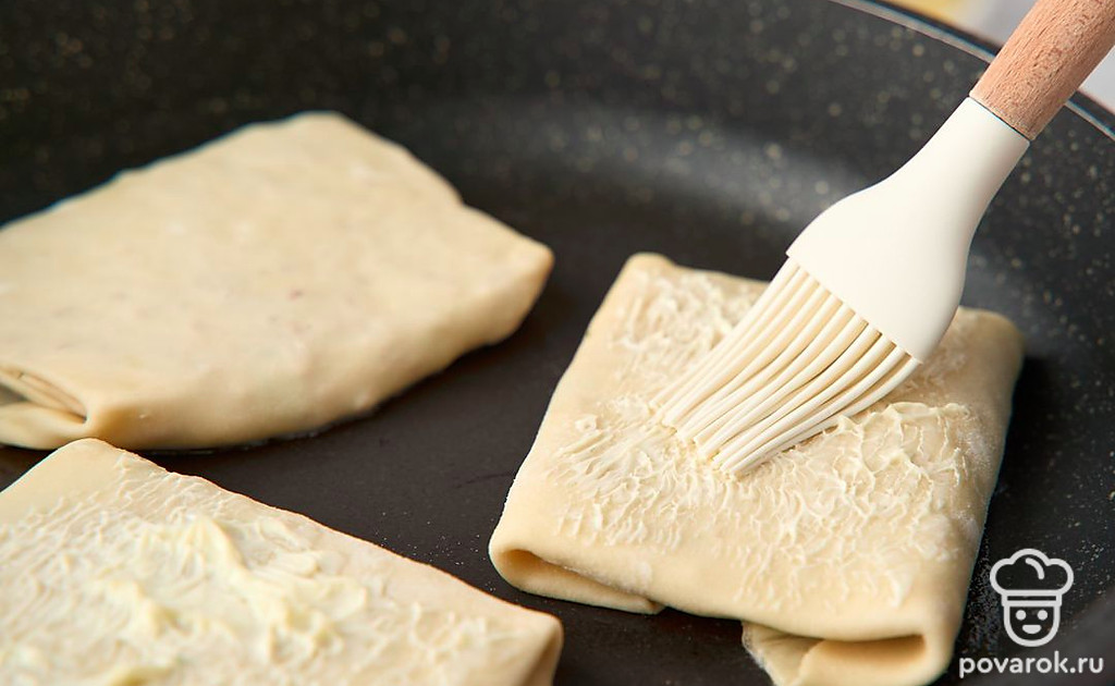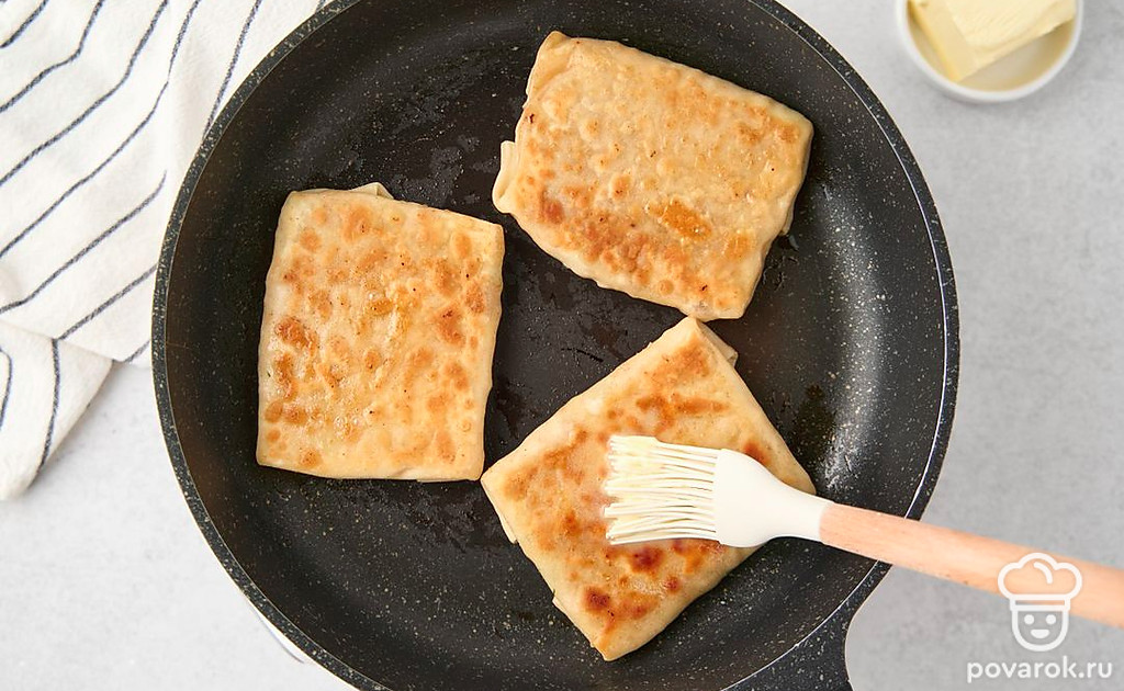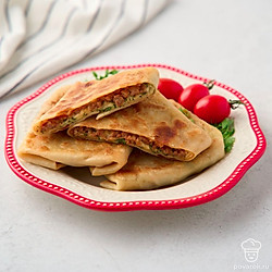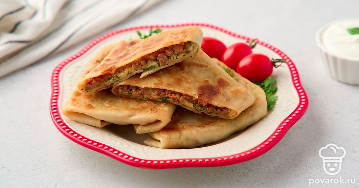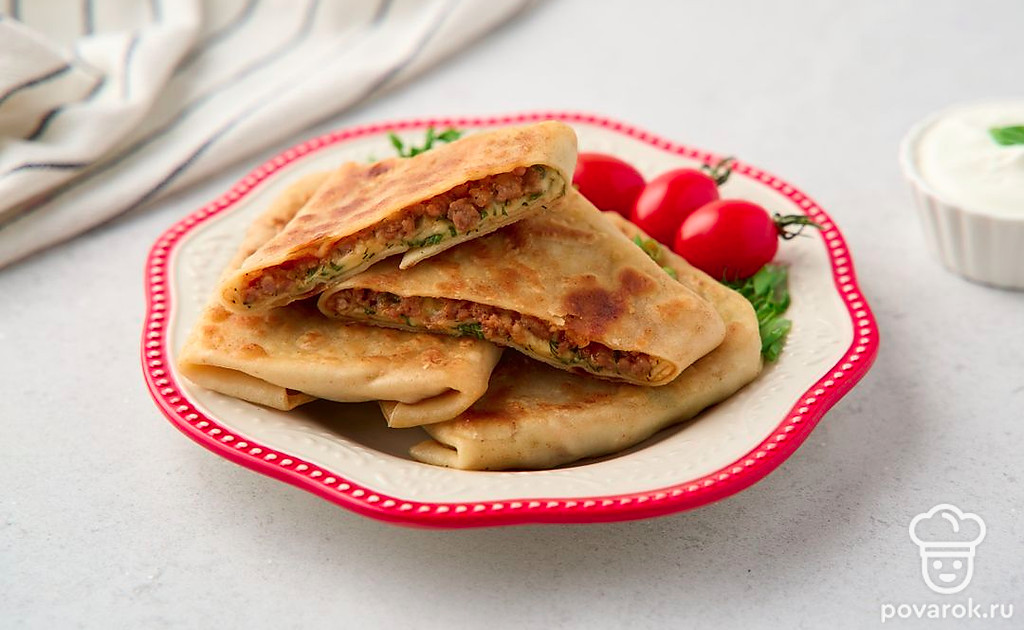 В турецких лепешках гёзлеме много сытной начинки и очень тонкое тесто, промазанное сливочным маслом и зажаренное до хруста. Тесто раскатывают до тех пор, пока оно не станет почти прозрачным. Потом выкладывают на него заранее приготовленную начинку и сворачивают лепешку в виде плоского прямоугольного конверта. Класть мясной фарш в начинку не обязательно. При желании сделайте лепешки просто с сыром и зеленью, творогом, брынзой, помидорами.